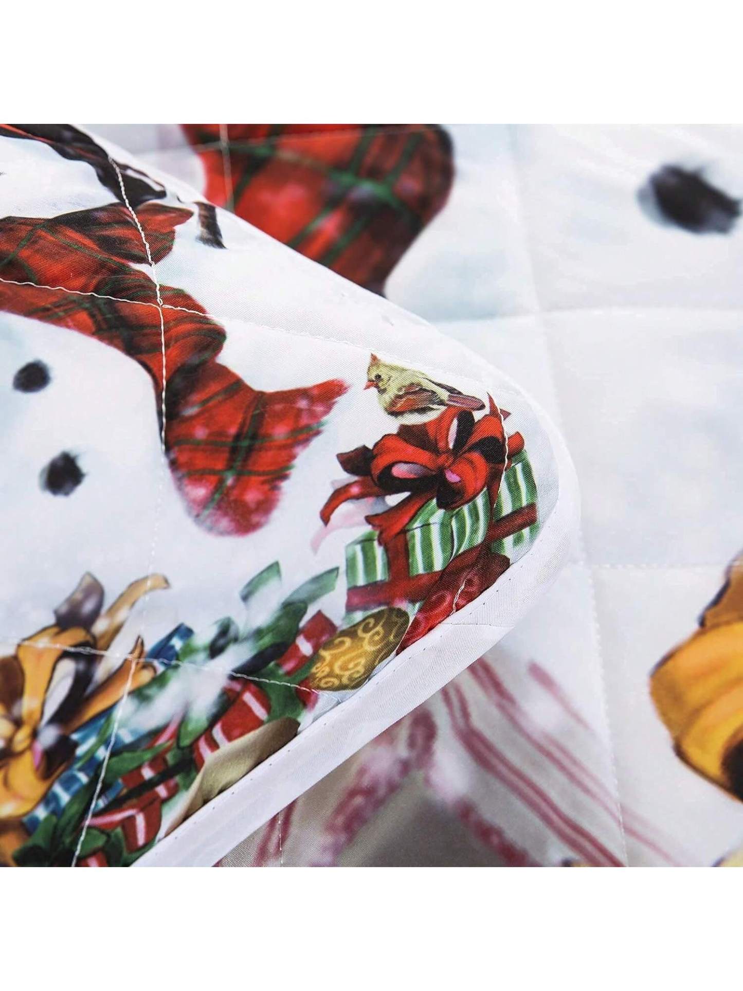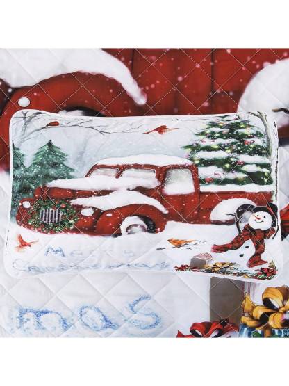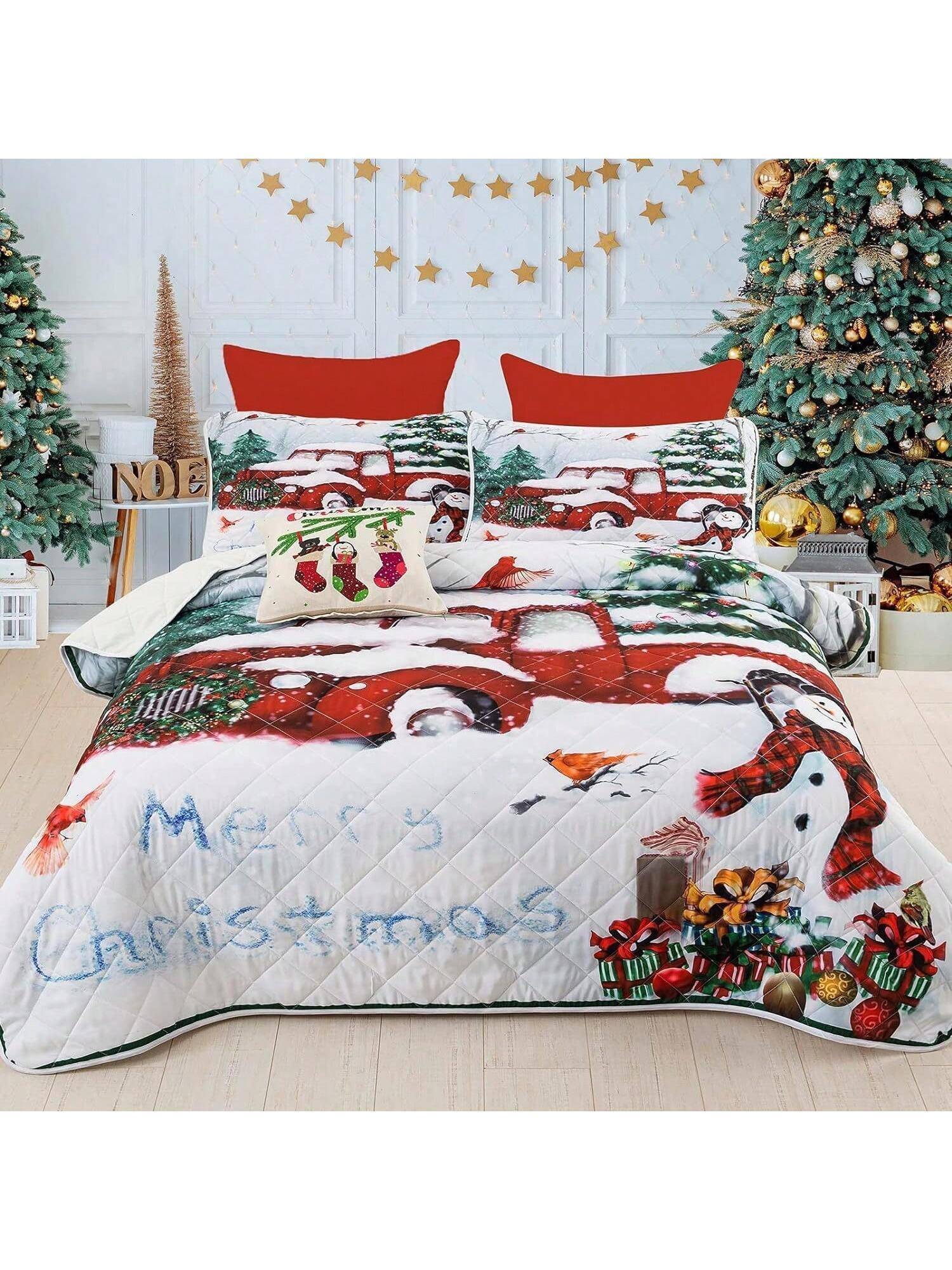 Christmas Quilt Set King 90"x103", Christmas Tree Cars Snowman Pattern Printed Bedding Quilted Bedspread Coverlet with 2 Pillow Shams for All , Soft Microfiber Reversible White Plaid Bedding