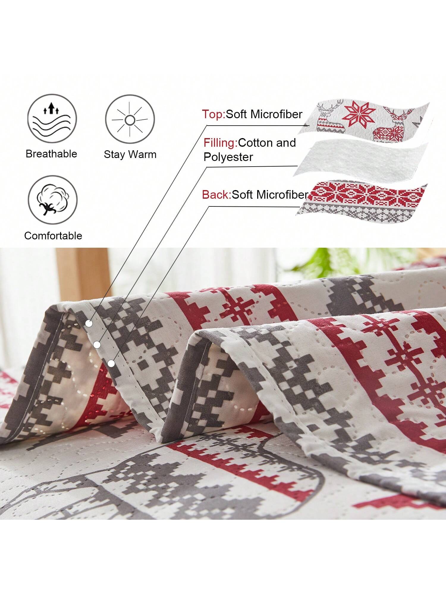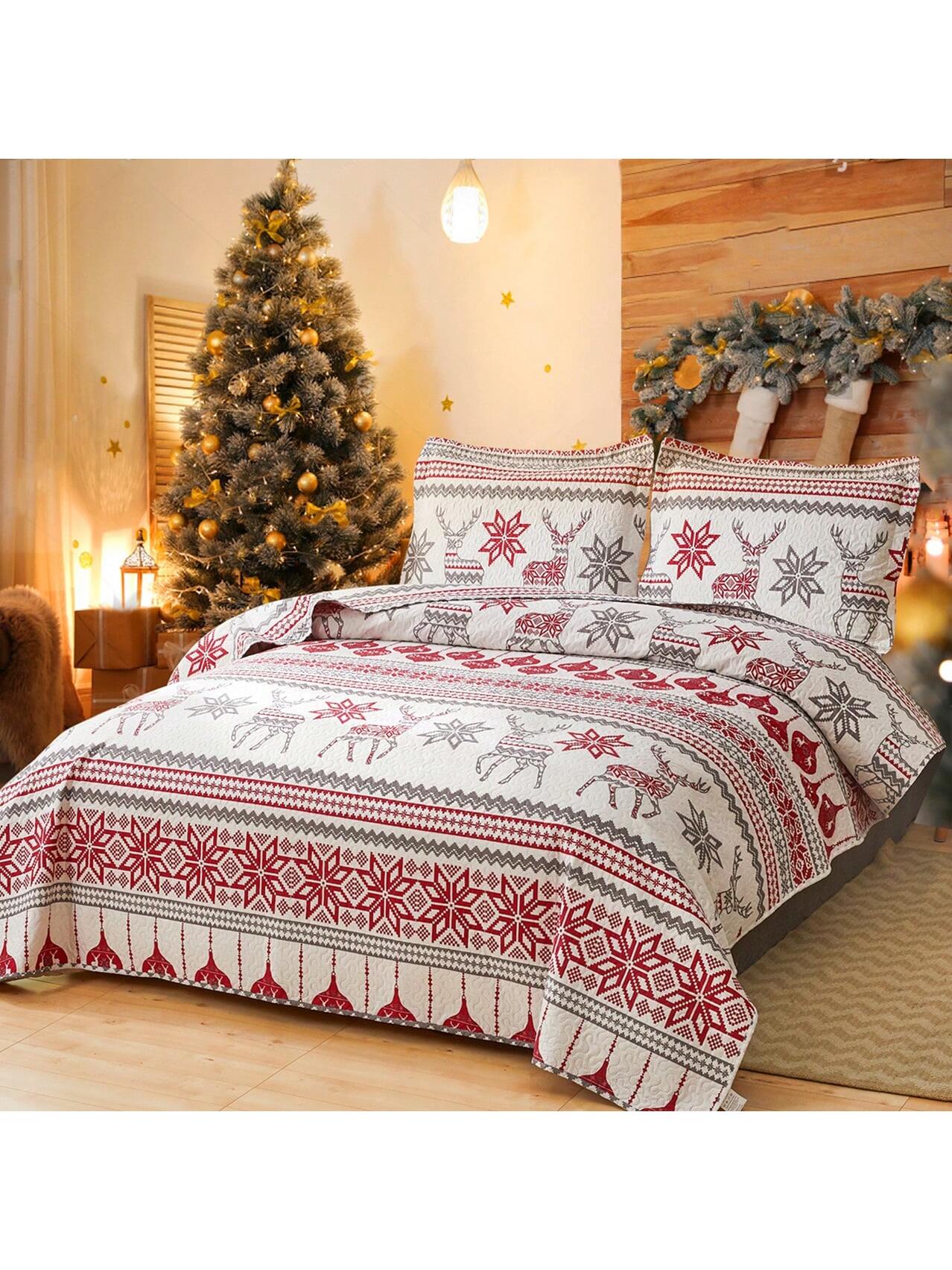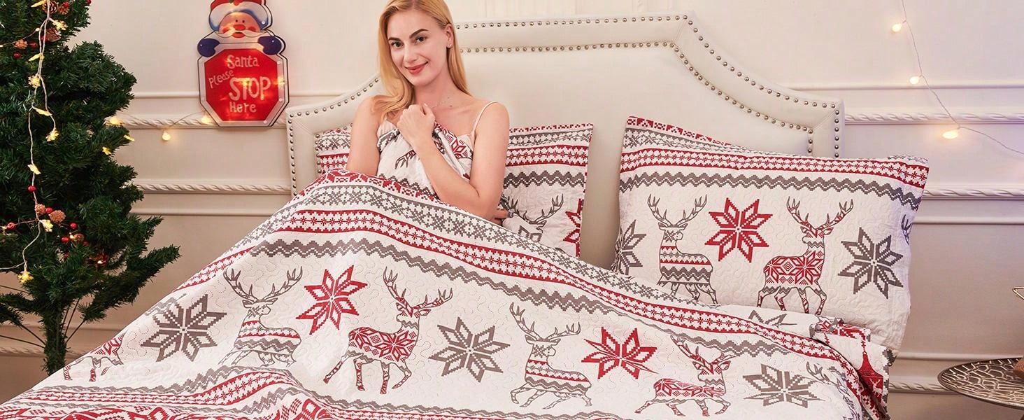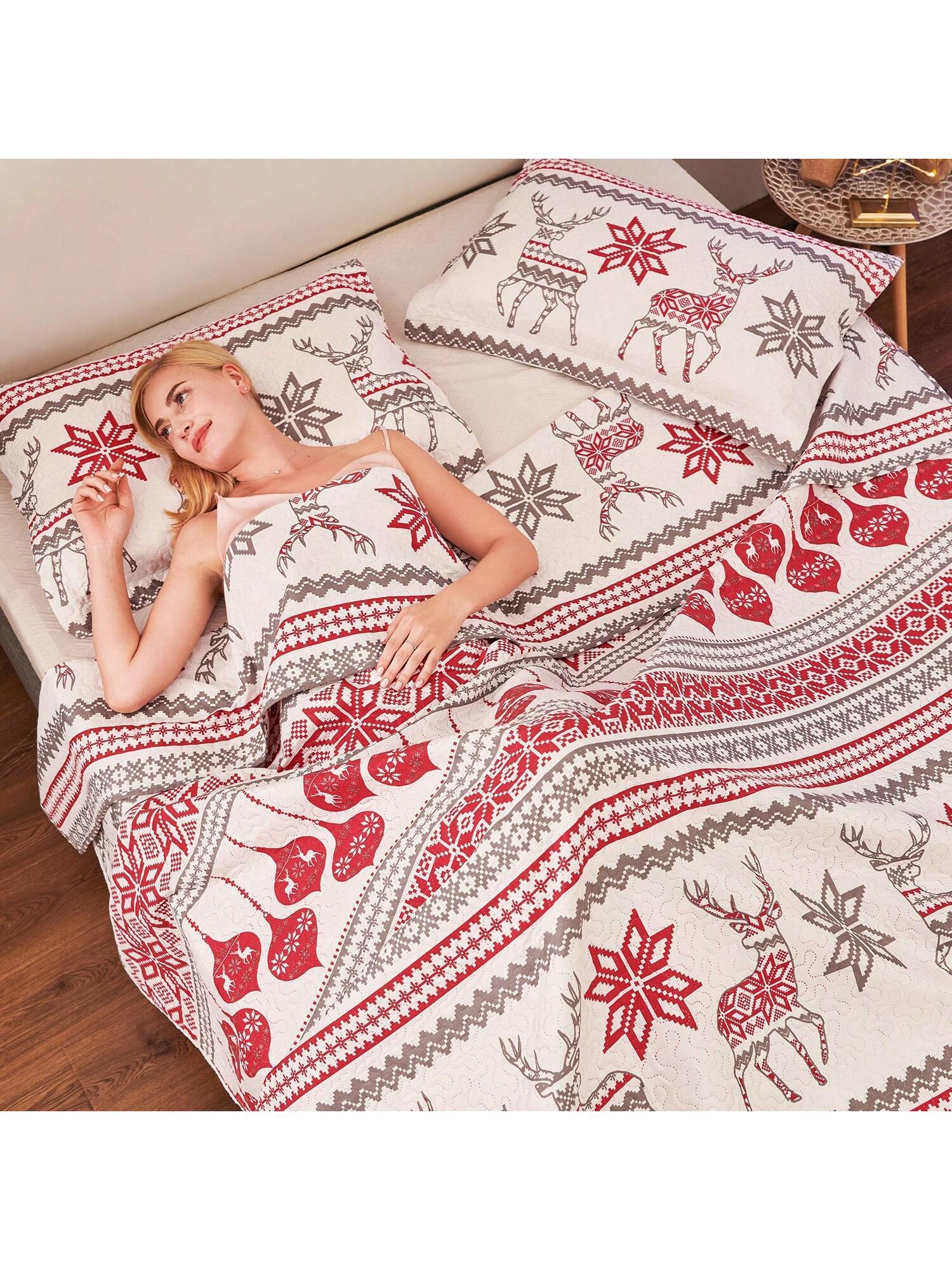 Christmas Quilt Set Twin Full/Queen King Size Christmas Bedding Xmas Quilt Bedspread Coverlet Holiday Christmas Quilt Bedding Deer Snowflake Christmas Decor Quilt Soft Lightweight Christmas Quilt Bedding,Red White