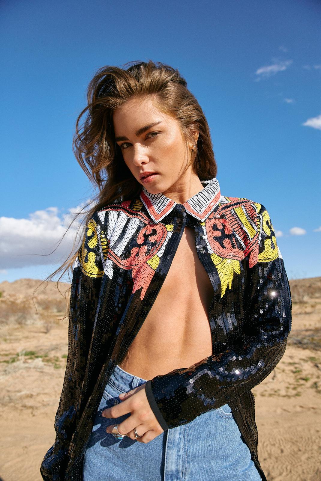 Yeehaw. Feel confident in our sequin shirt, made in high quality sequin fabric, in a flattering relaxed fit, with a unique western style. Style it with denim shorts and cowboy boots for a look that will take you anywhere from festival weekends to nights out and parties. Main Fabric 100% Polyester. Lining 100% Polyester. Exclusive of trims. Hand wash only.