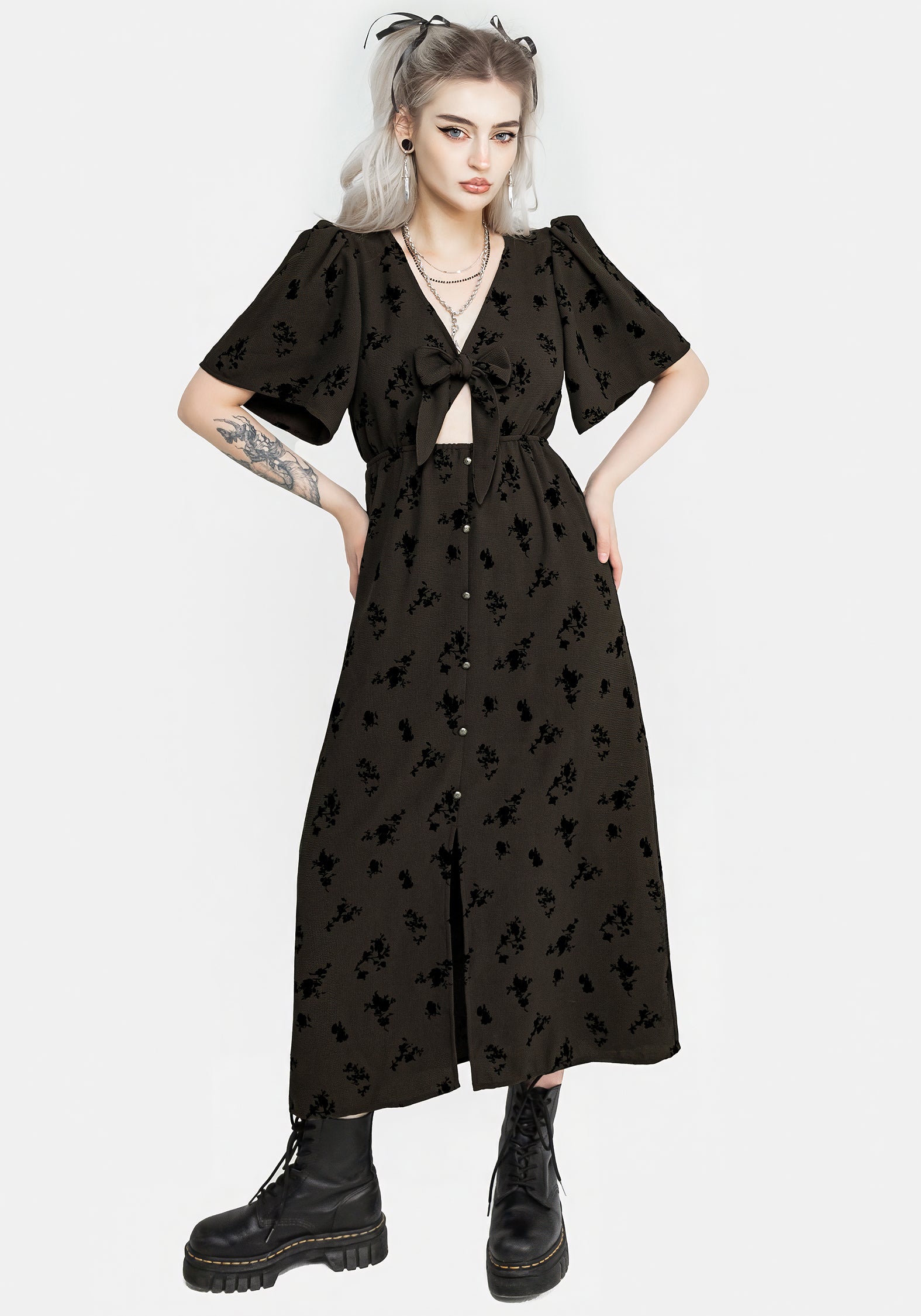 - Sturdy woven fabrication in a dark khaki brown shade embellished with black flocked florals