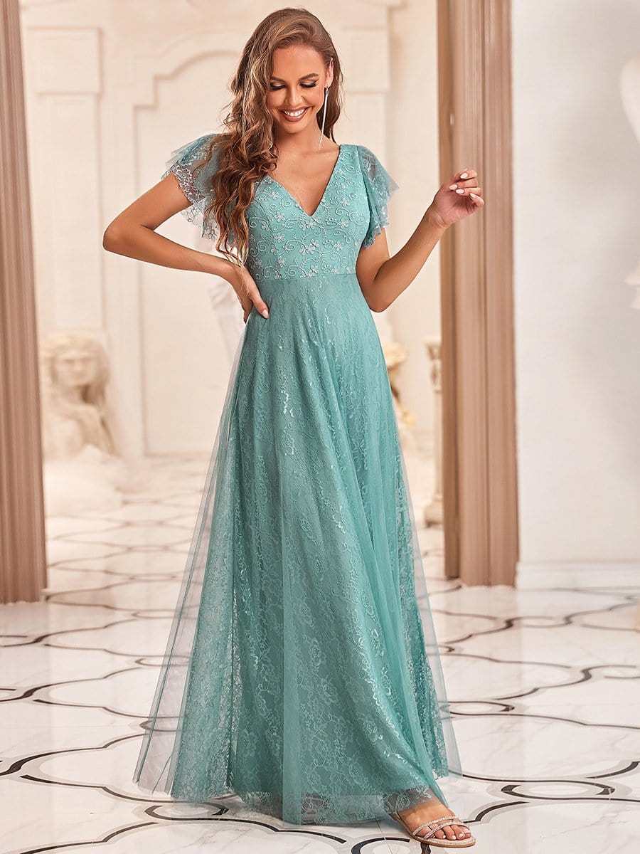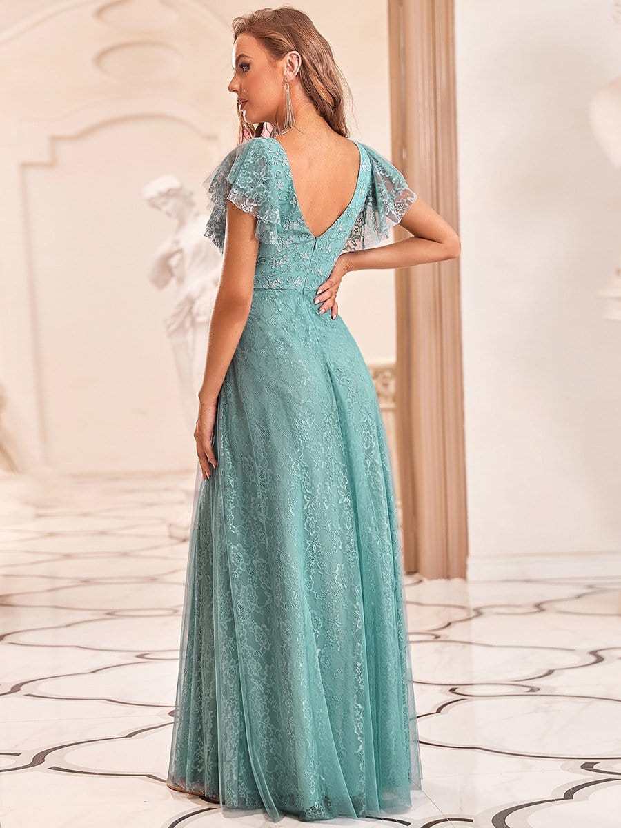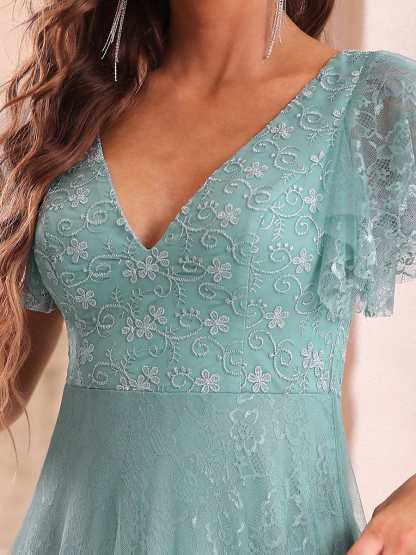 A sexy double deep V neckline and ruffles sleeves draw the eye down and elongates the torso for a lengthening and slimming silhouette. This beautiful dress also features a lace and tulle skirt which gives a romantic air, and make you feel like a fairy princess.