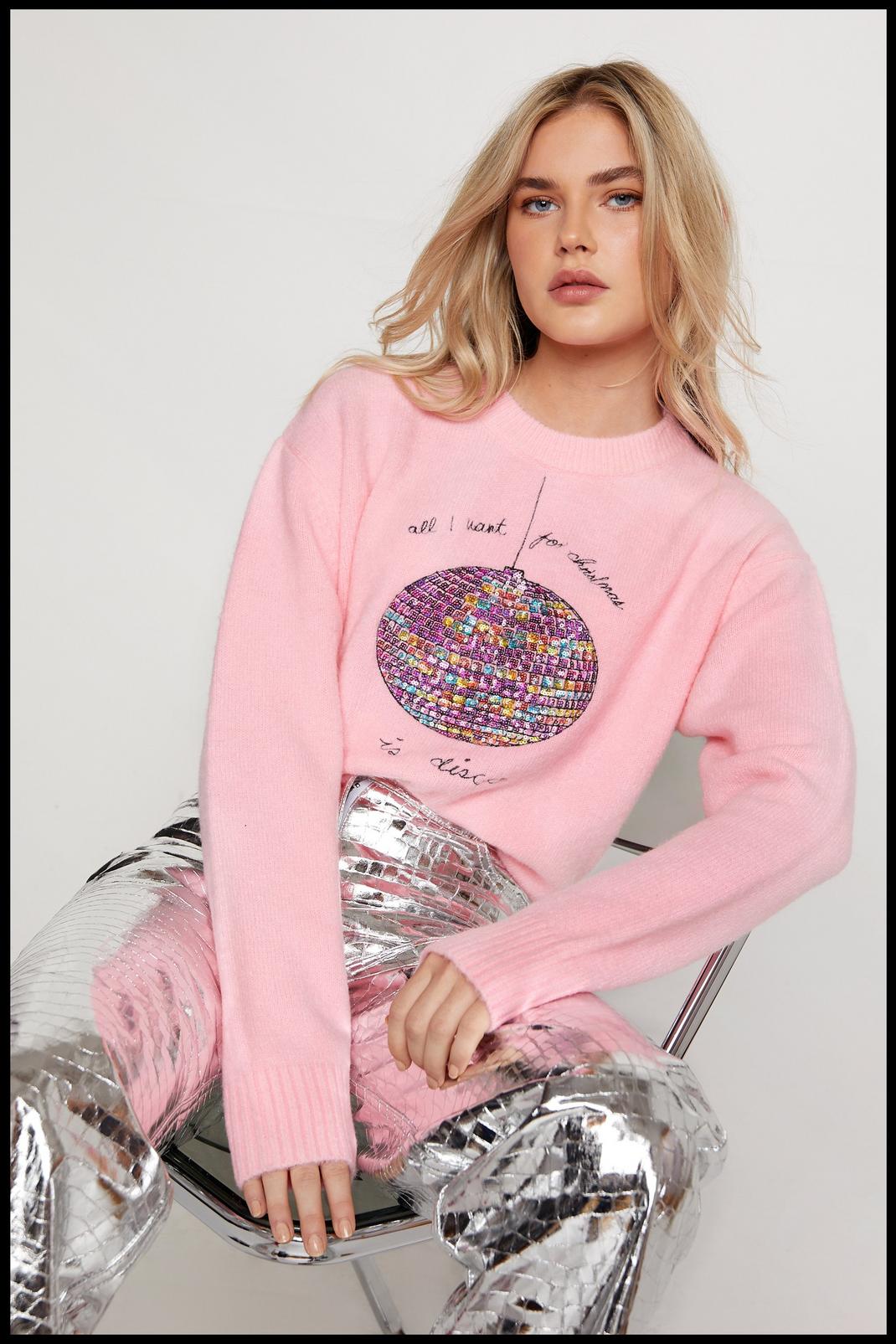 Happy Yee Hawlidays. Introducing the Christmas Cowboy collection, designed by British artist Emmy Lupin. Feel comfy in our knit sweater, with a fun, disco themed Christmas graphic, and a fun slogan design. Style it with leggings, leather pants, or jeans for a look that will take you from Christmas walks to festive drinks.