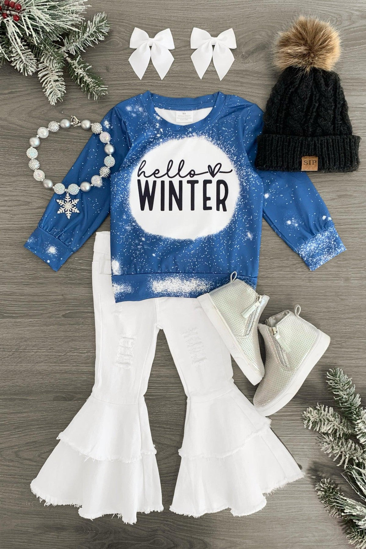 Bring on the season with this "Hello Winter" Denim Bell Bottom Set for girls. The blue long sleeve top features a cute saying on the front and is paired with matching white denim bell bottoms. The adjustable waistband helps comfort and fit and can be great for on the go, while the distressing add a fun touch. Pair this set with our matching or keep it laid back with a pair of for the perfect look!