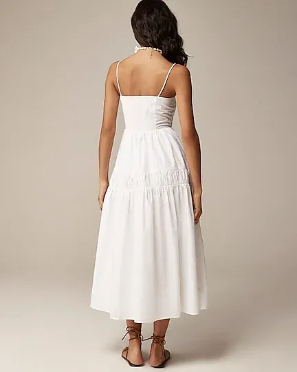 This elevated style has buttons all the way down the front, a fitted waist and a subtly flared skirt with ruched paneling around the center for a ruffle effect.