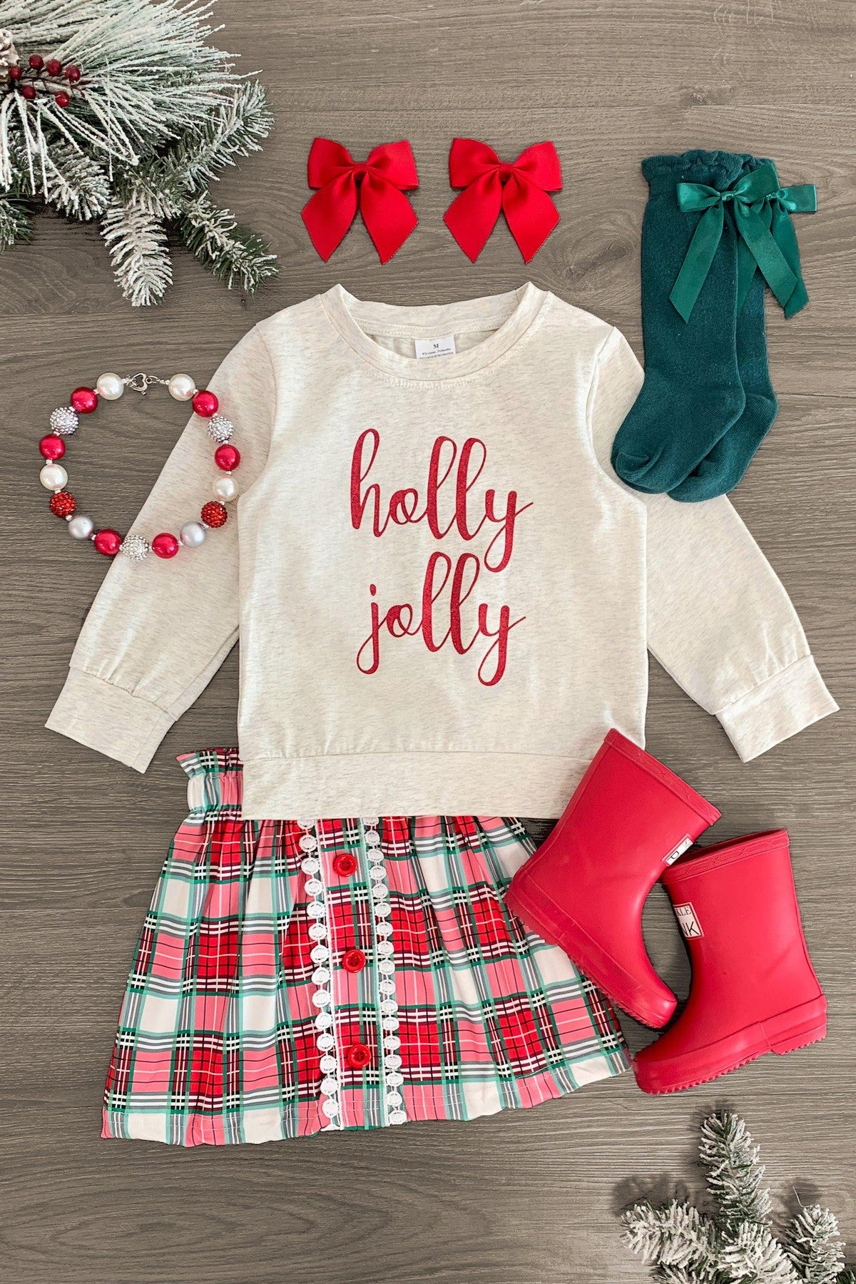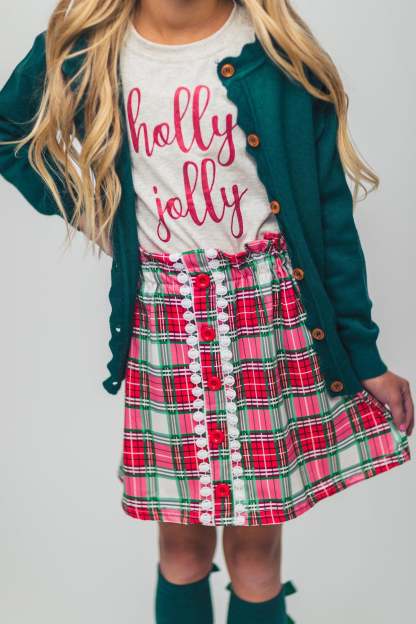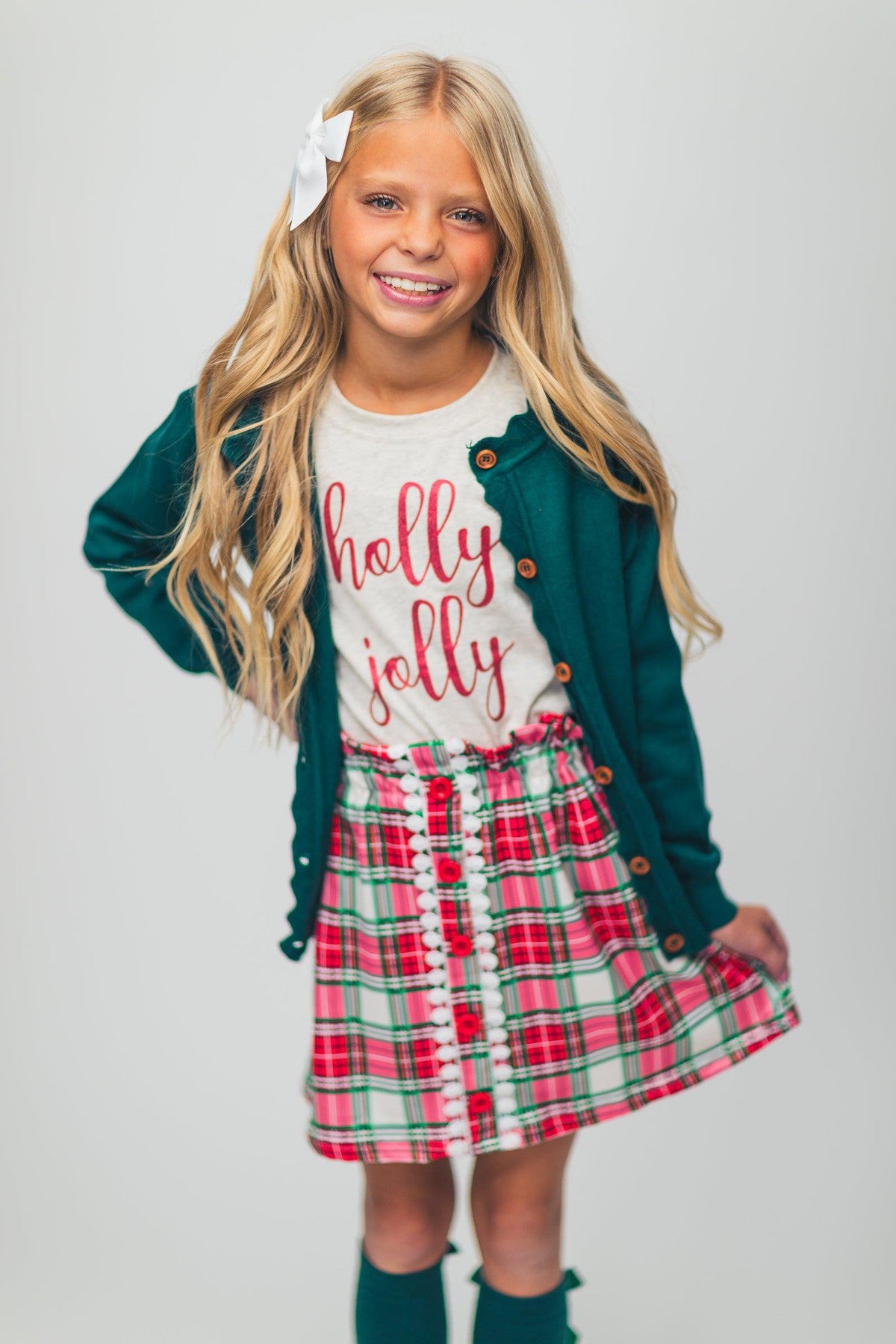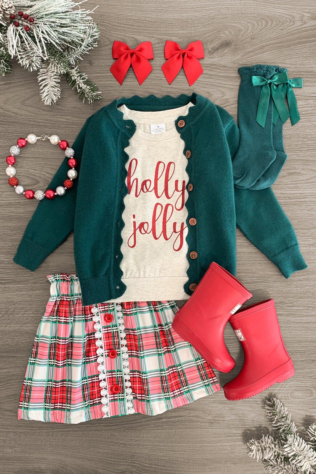 Add sweet & festive style to her look with this "Holly Jolly" Green Sweater Skirt Set. This girls' set is styled with a cream long sleeve top making it a staple addition to her everyday wear. Paired with a plaid skirt & matching green cardigan, it adds a playful twist to her look. The breathable fabric makes for cool and comfy wear, while the pull-on style allows for simple dressing. She can pair this set with or a matching for a cute look!