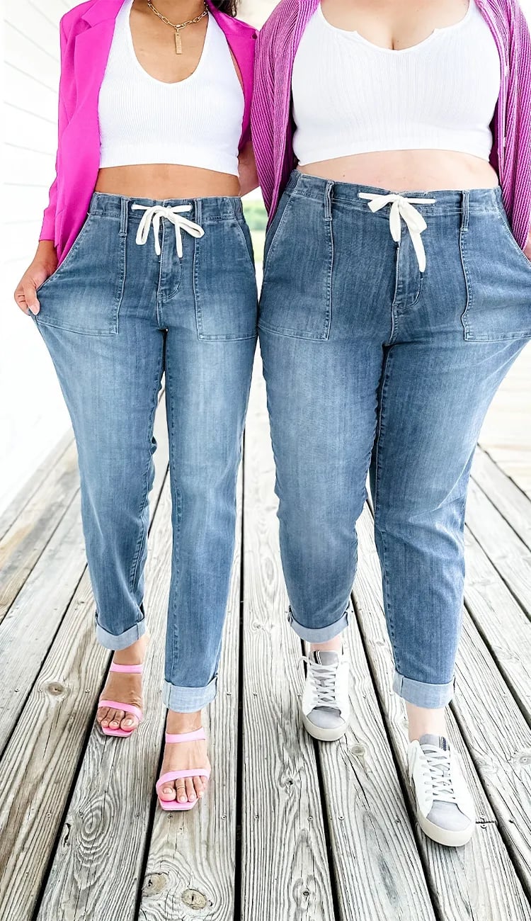These jeans have a functional drawstring waist, button and zip closure! They're a true jean with so much style jam packed into them.