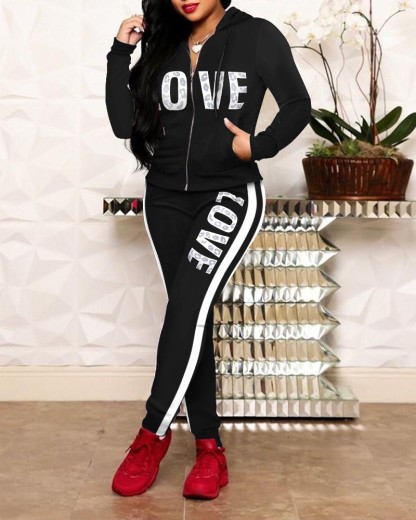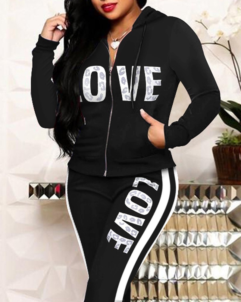 Leopard Love Letter Print Hooded Sweatshirt & Striped Pants Set