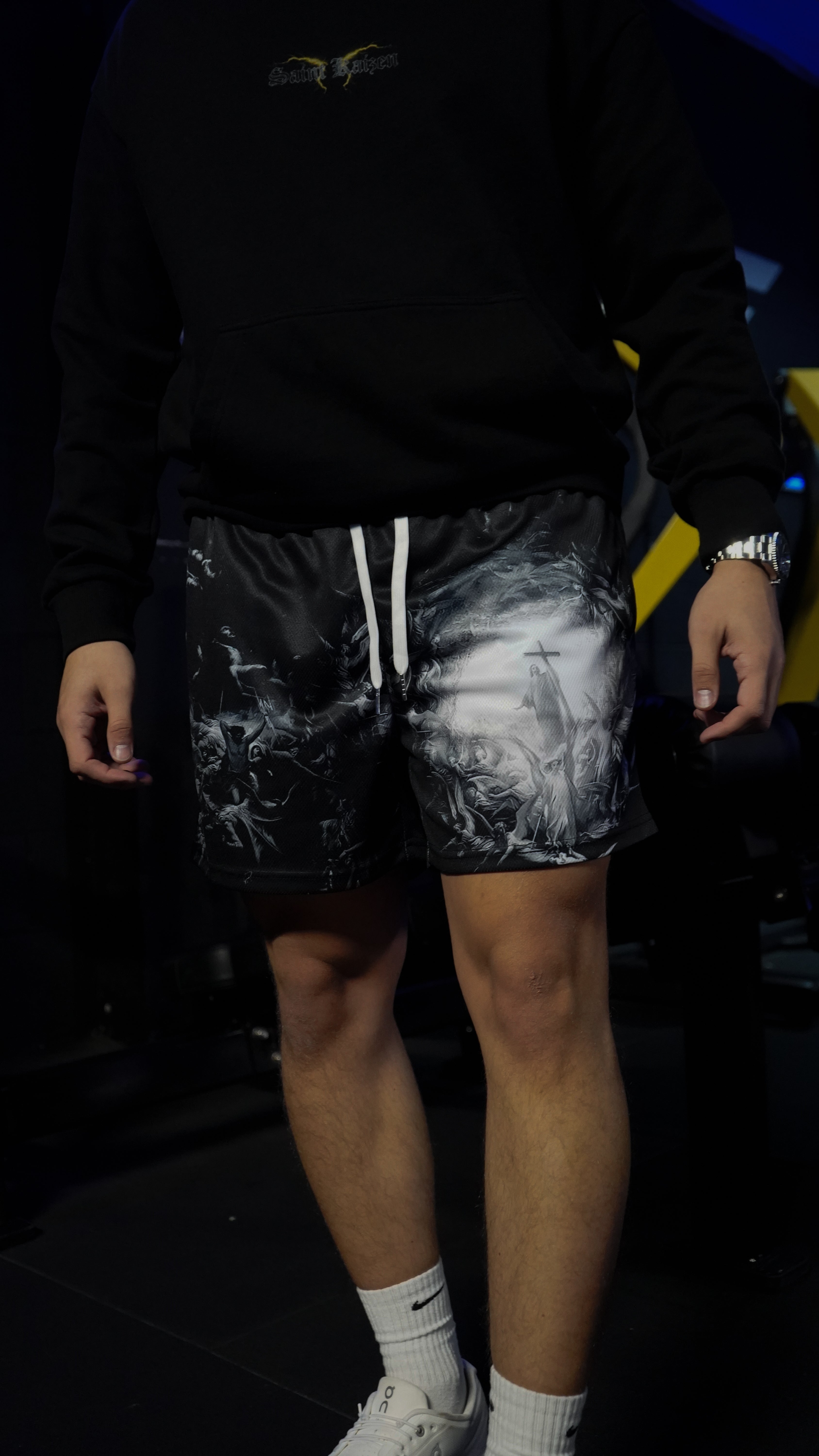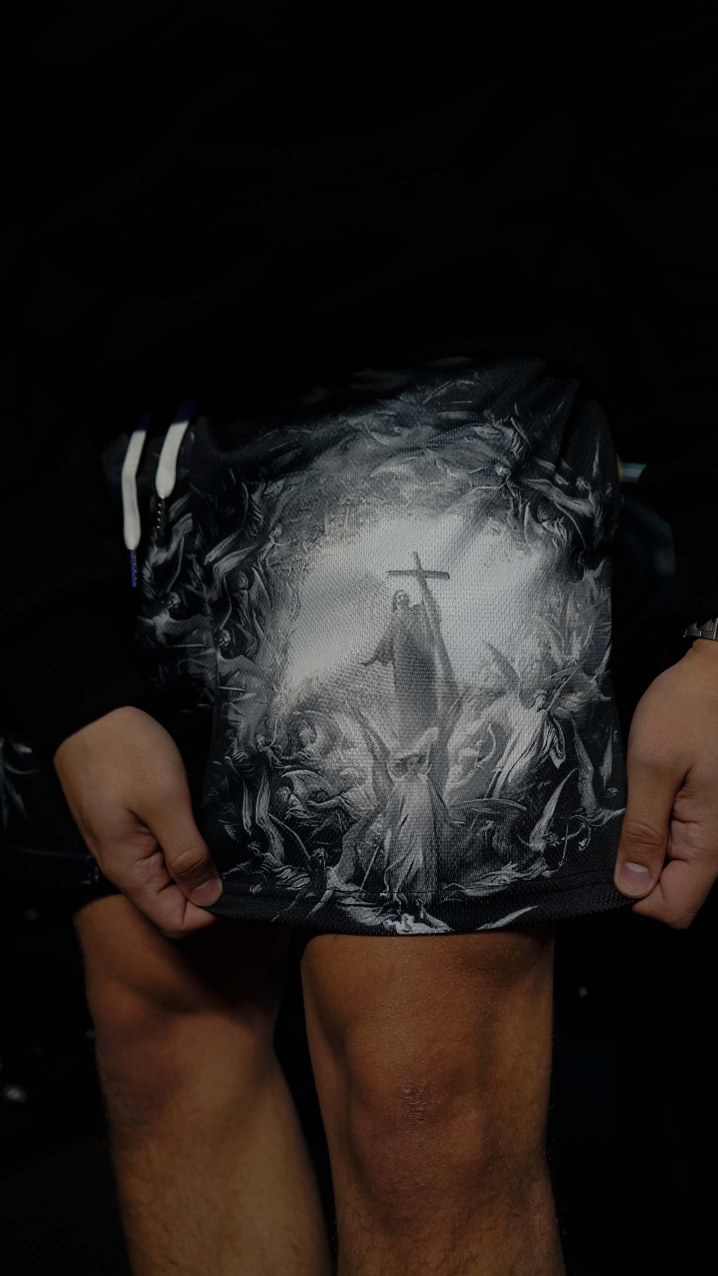 Elevate your workout wardrobe with our Light Into Darkness mesh shorts, designed for those who seek both performance and inspiration. These gym shorts are perfect for fitness enthusiasts who want to carry their faith with them. Each design is based on Christian themes and Bible verses, providing motivation and strength.