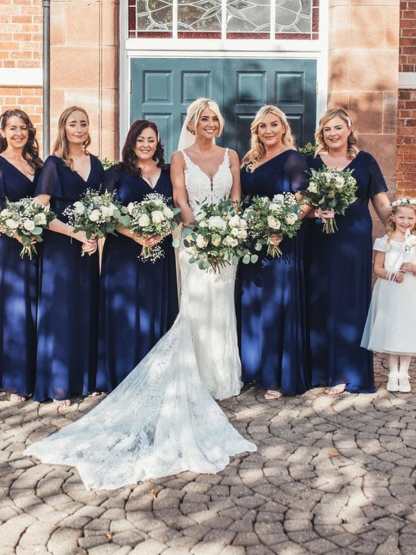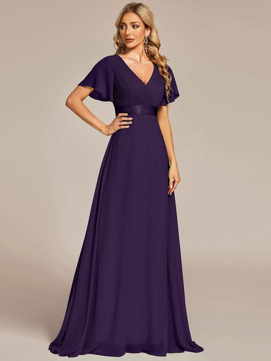 This beautiful chiffon bridesmaid dress features a v neckline, empire waist, flutter sleeves, and subtle high low hemline. It's perfect for weddings.