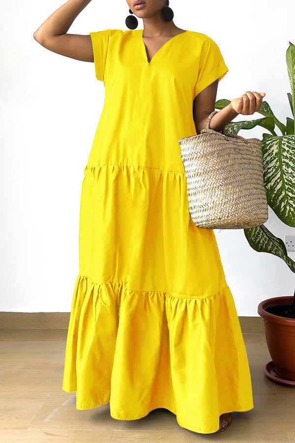 Stay on trend this season in our new casual, v neck dress. We especially love the solid color fabric and think this piece will be a new favorite in your closet!