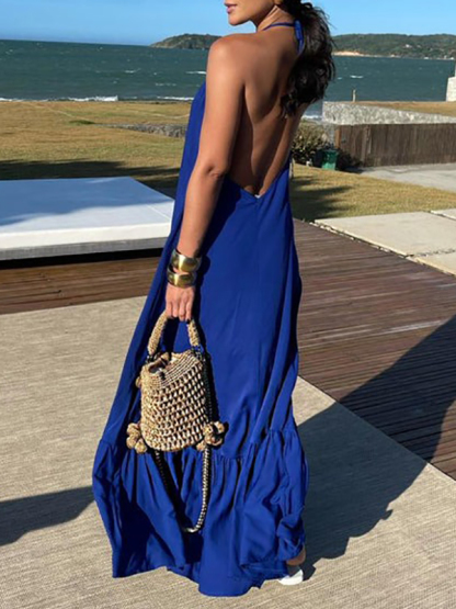 Loose Sleeveless Backless Pleated Solid Color Halter-Neck Maxi Dresses
