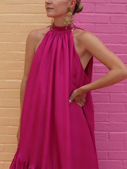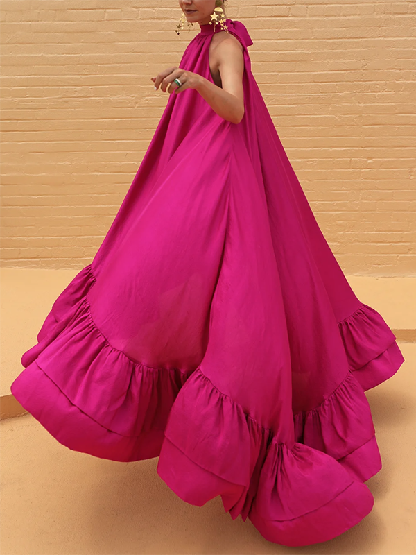 Loose Sleeveless Falbala Solid Color Stand Collar Maxi Dresses