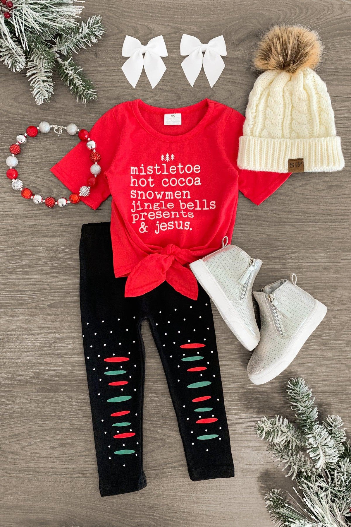 Add sweet, festive style to her look with this "Mistletoe, Hot Cocoa..." Legging Set. The red short sleeve tie top features "Mistletoe, Hot Cocoa, Snowmen, Jingle Bells, Presents & Jesus" on the front and looks adorable paired with the matching leggings. The stretchy waistband helps comfort and fit, while the faux distressing adds a fun touch. Pair this set with our matching or keep it laid back with a pair of for the perfect look!