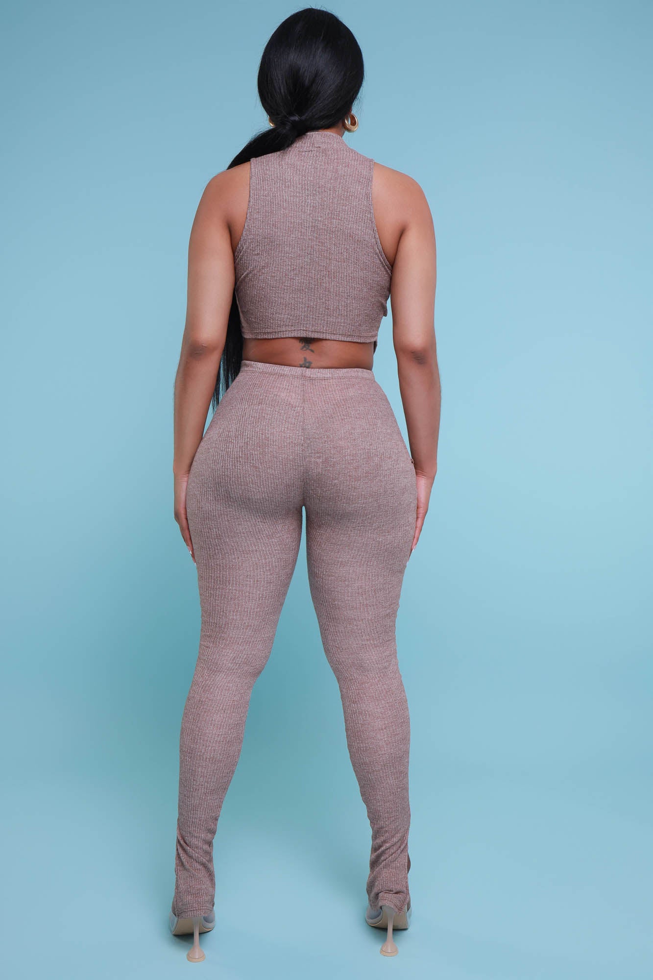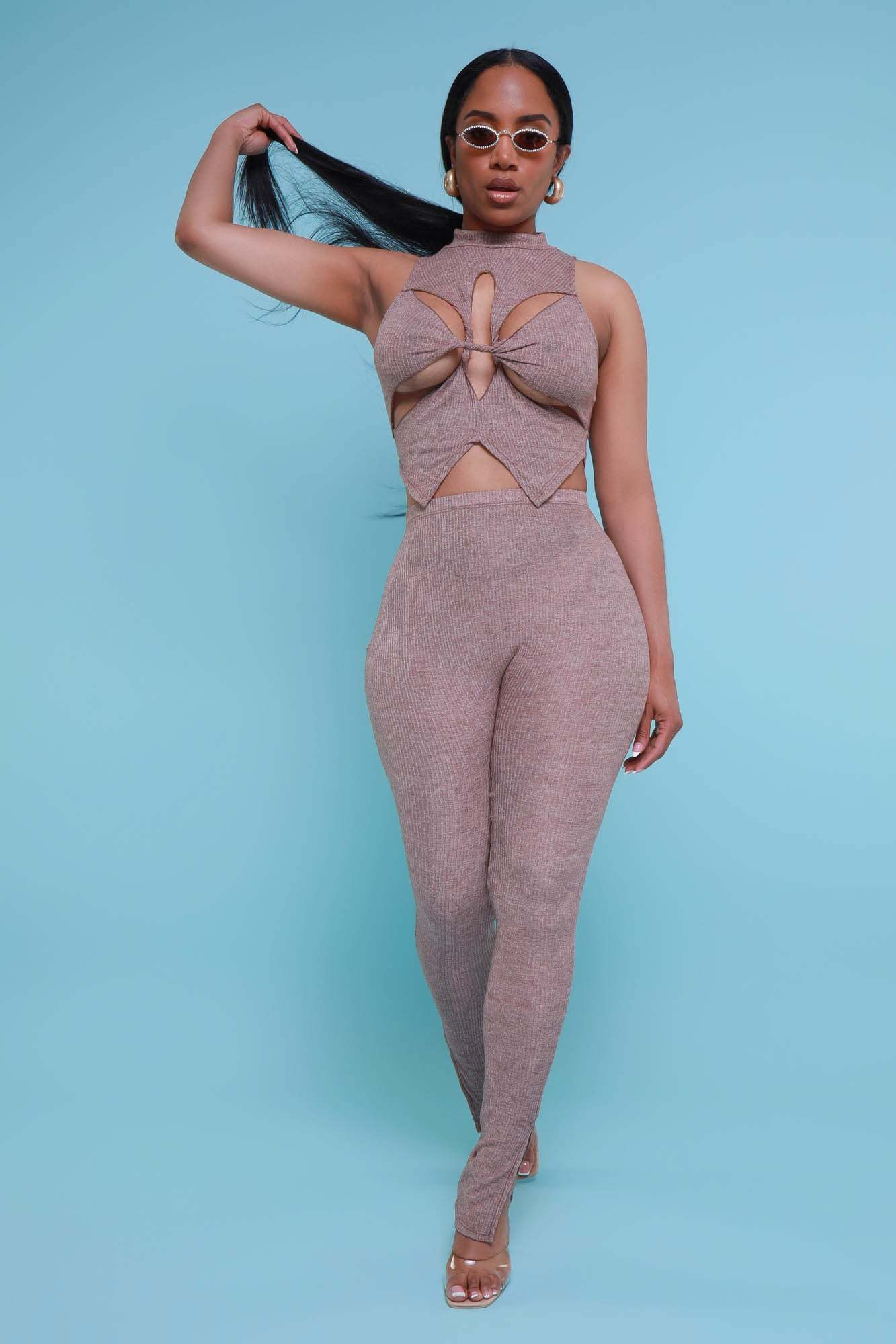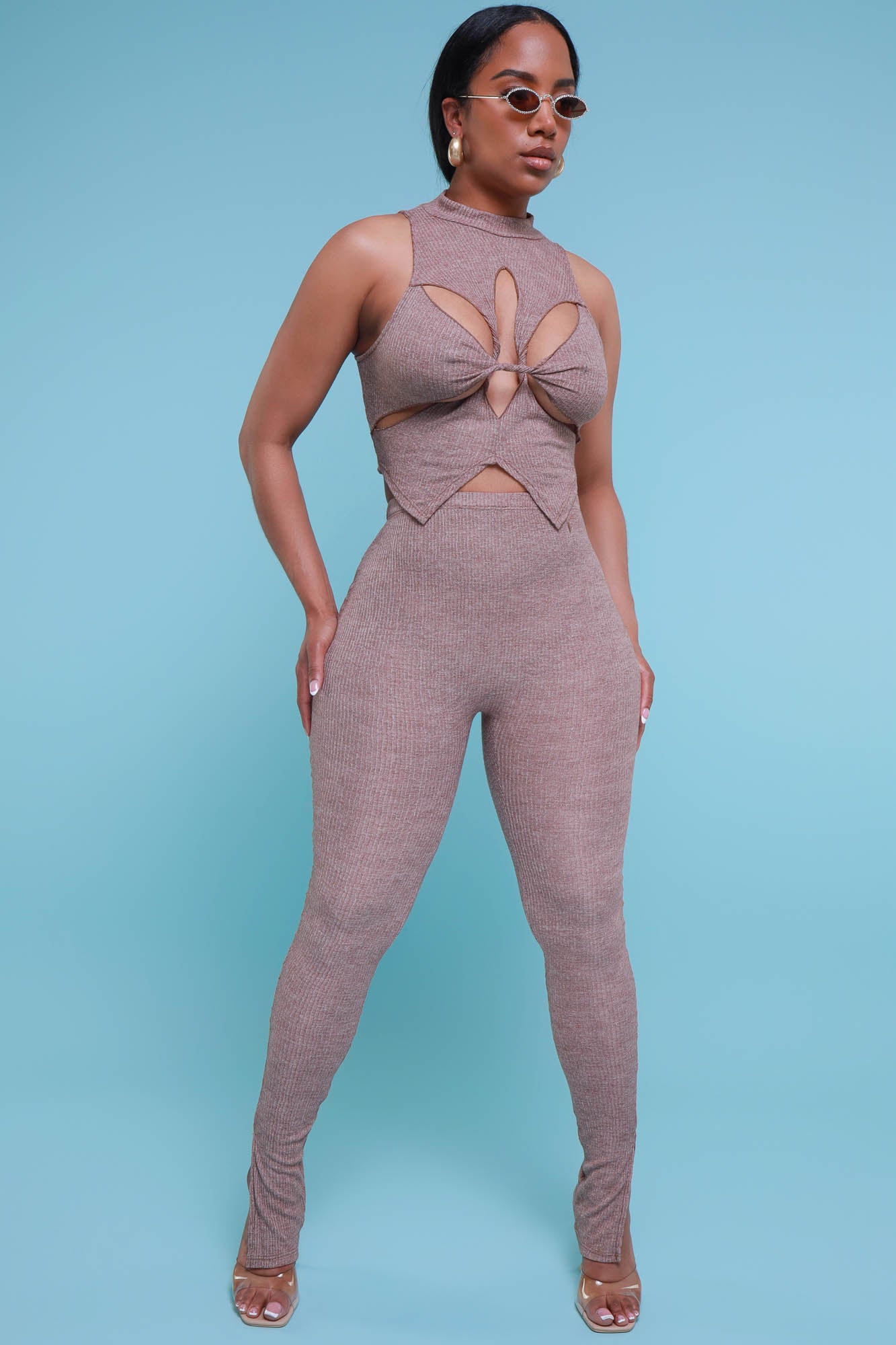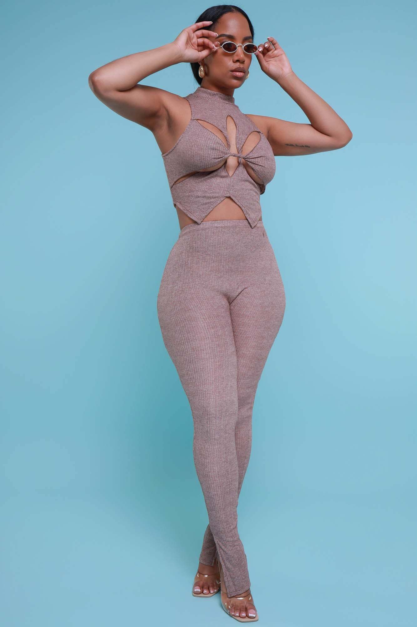 Look your best when you arrive in this stylish set featuring a sleeveless top with strategic cut outs at the chest and waist with a high mock neckline and matching high rise leggings with ruching at the ankles in soft stretchy ribbed fabric.