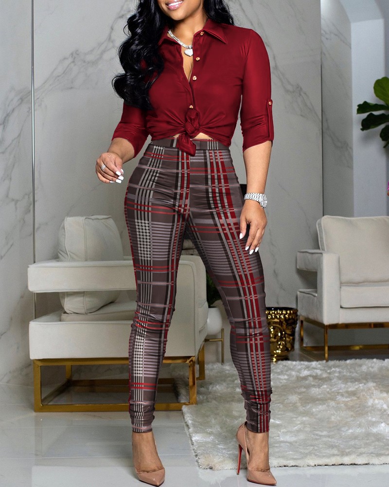 Plus Size Long Sleeve Buttoned Shirt & Plaid Print Pants Set