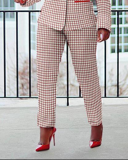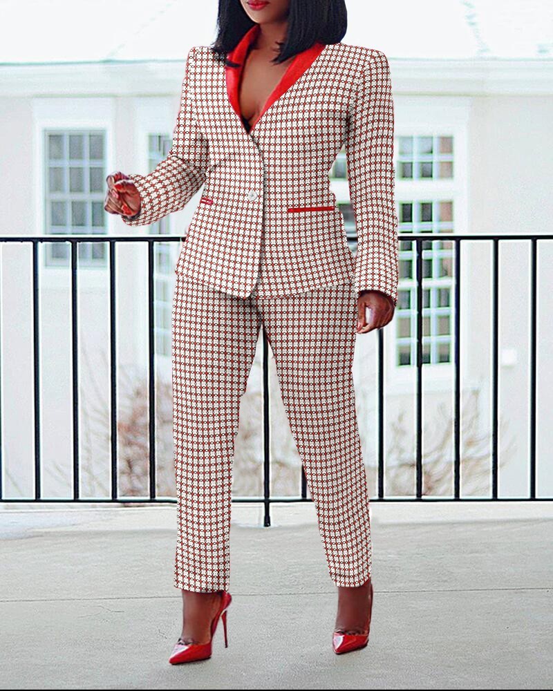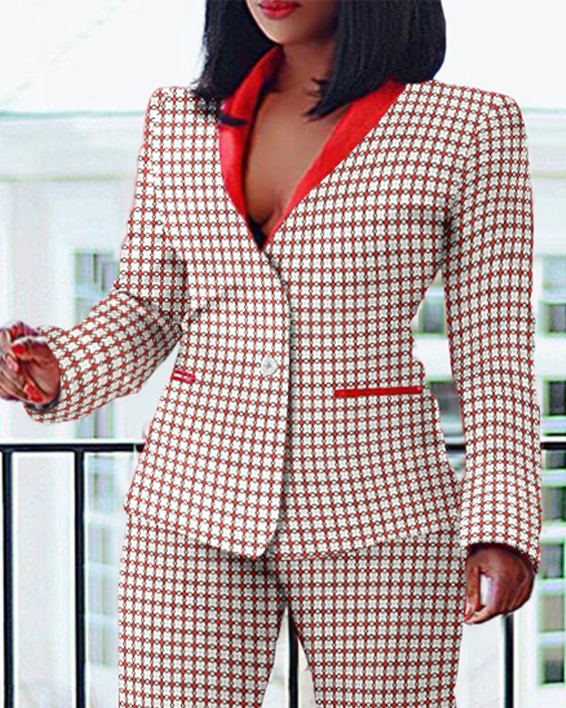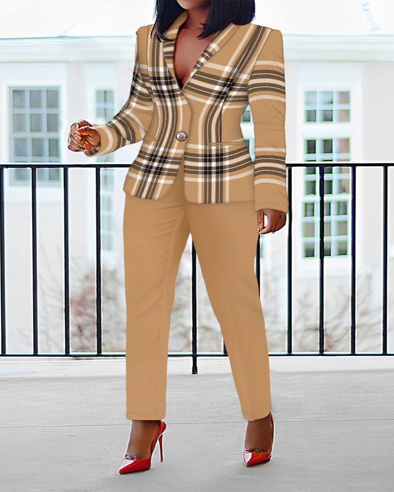 Plus Size Plaid Print Buttoned Blazer Coat & Pants Set