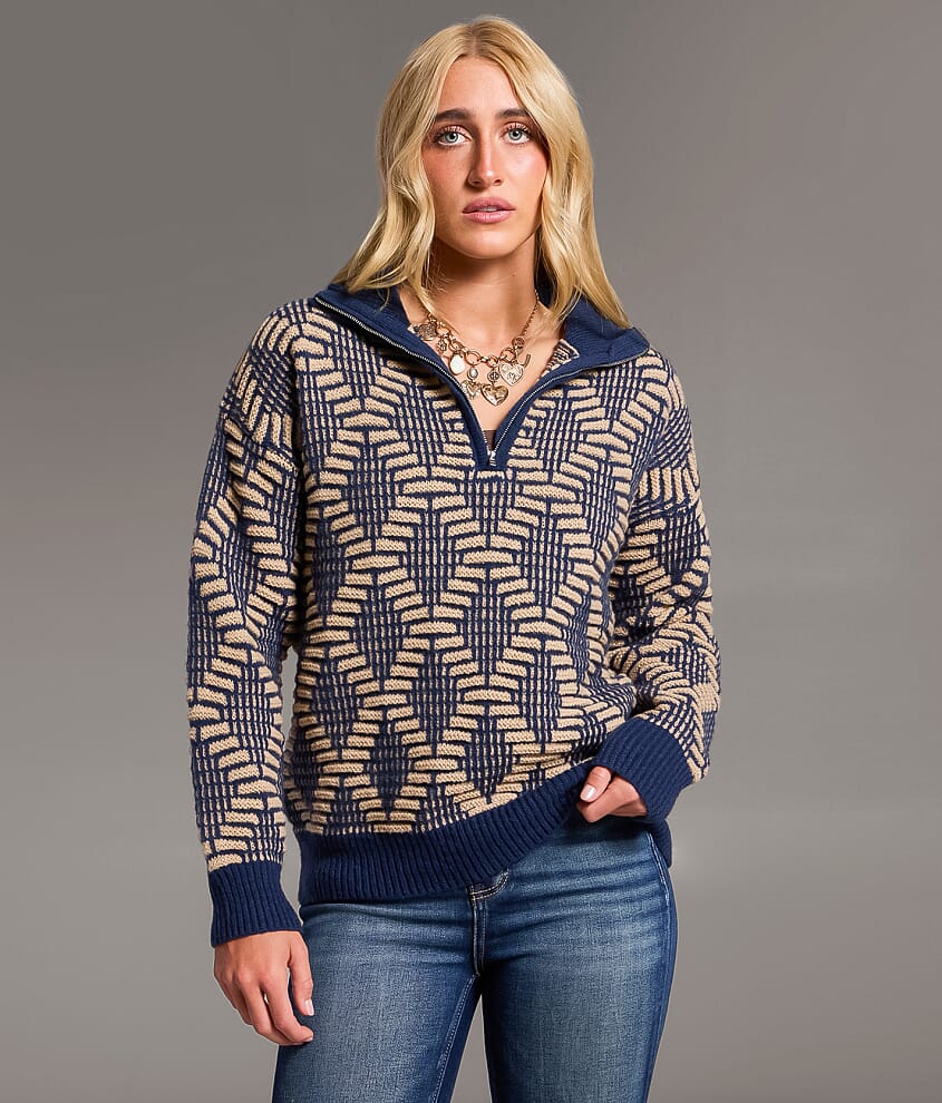 Elevate your fall wardrobe with this stylish quarter-zip pullover featuring an eye-catching diamond textured pattern in rich navy and warm beige. The cozy knit construction offers both comfort and sophistication, while the quarter-zip collar adds versatile styling options. Perfect for holiday gatherings or casual weekend outings, this BKE sweater effortlessly pairs with your favorite jeans for a timeless seasonal look.