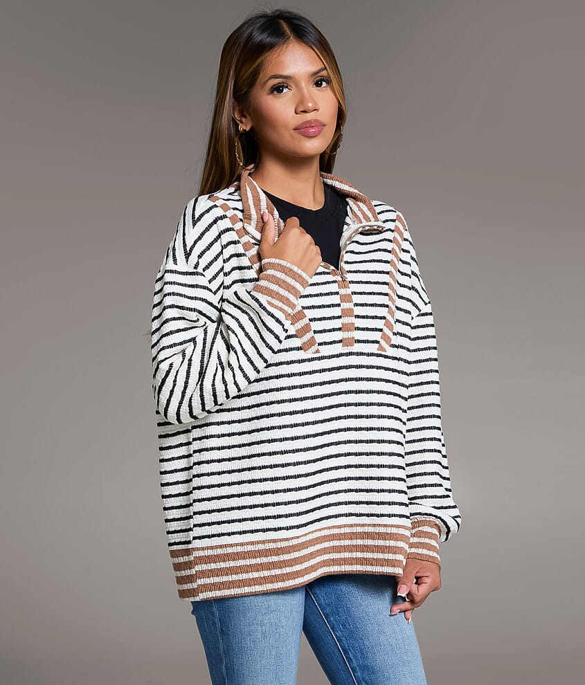Crafted from soft, comfortable fabric, this versatile pullover features a bold striped pattern that adds a pop of color to any outfit. Complete with a convenient half-zip front and ribbed cuffs, it's perfect for layering or standing alone - a must-have addition to your wardrobe!
