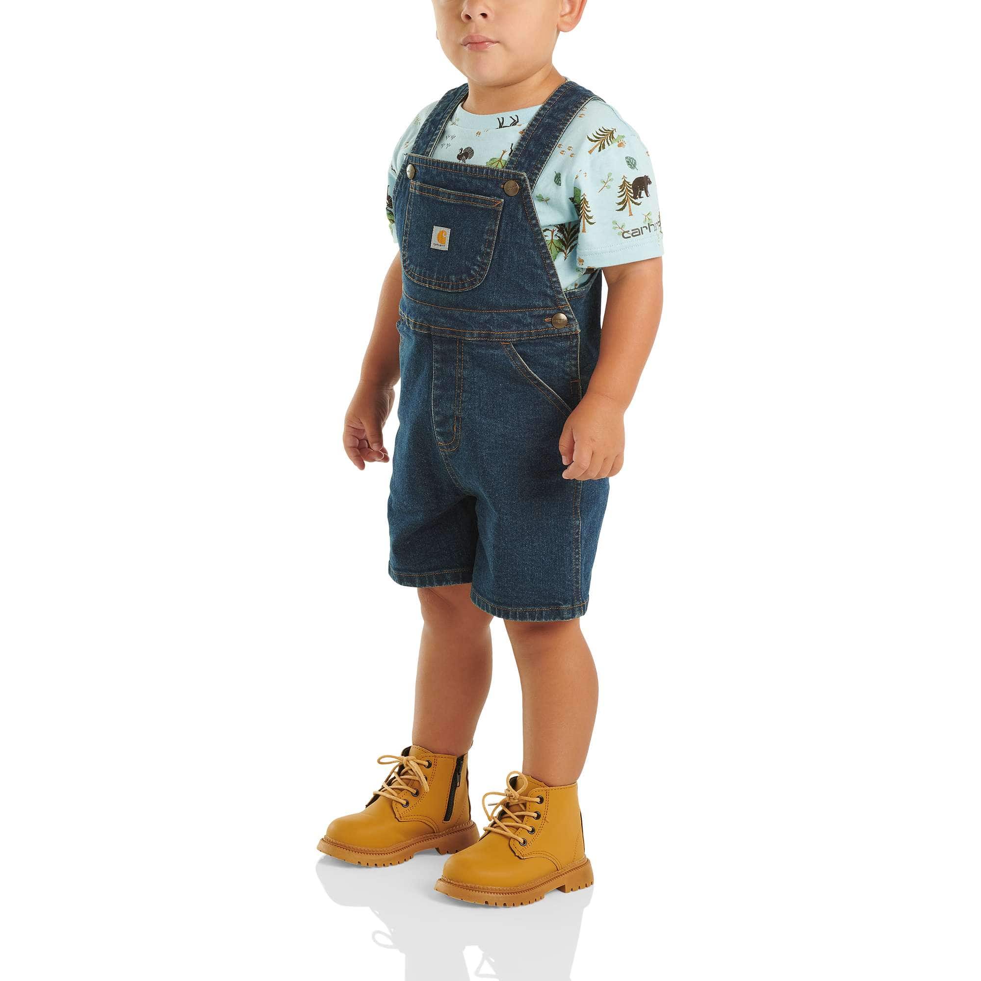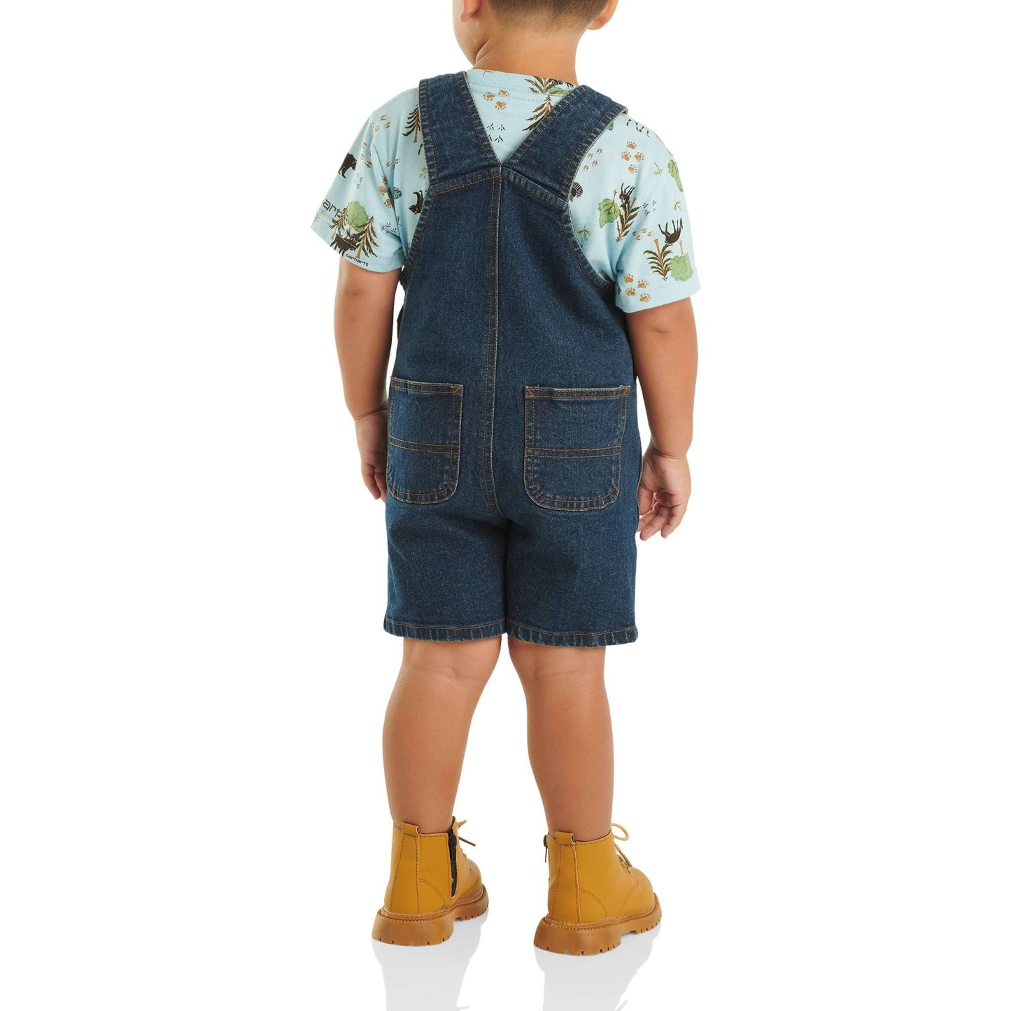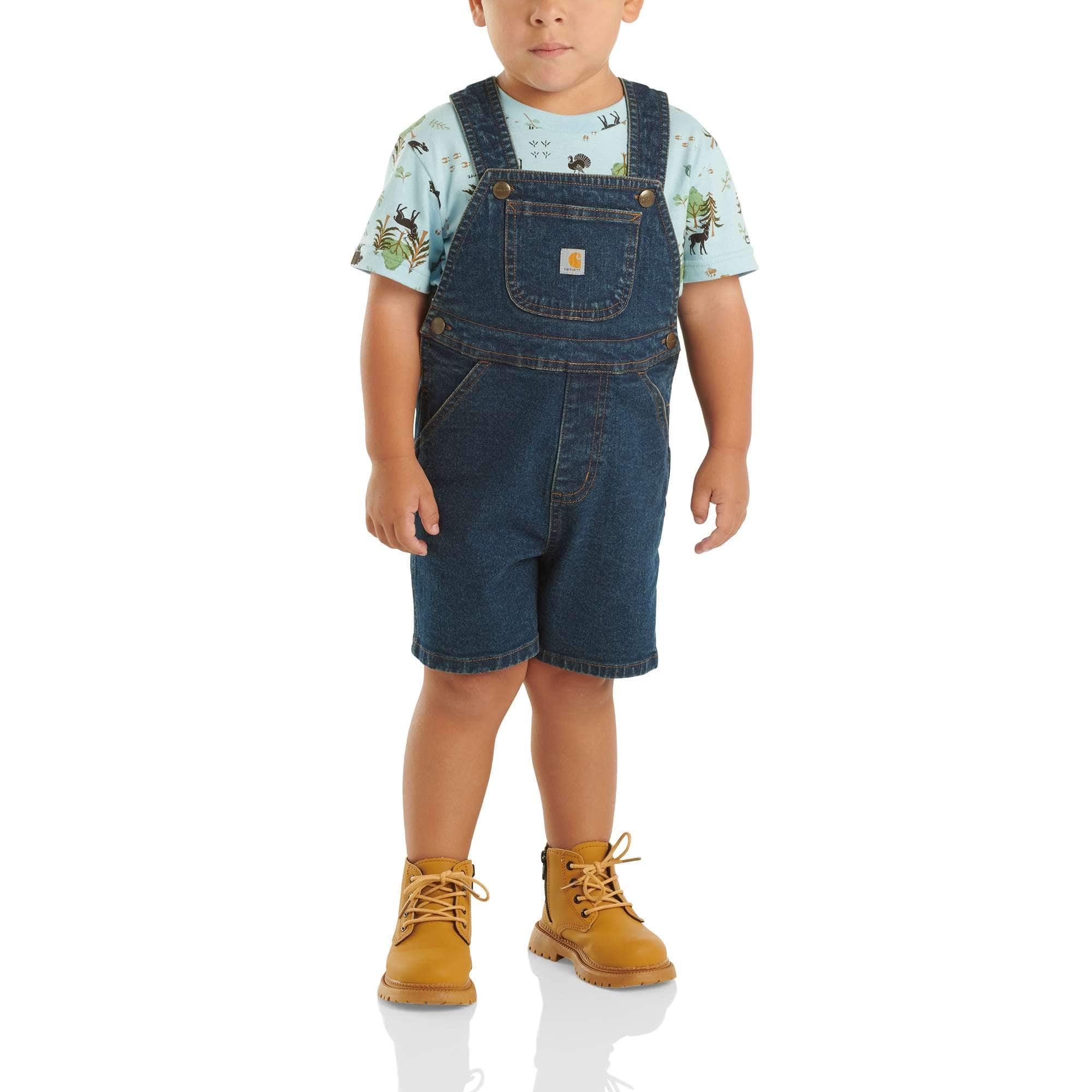 Made to get muddy. This toddler boys' set includes an all-cotton t-shirt and durable denim shortalls. An outdoor print and Carhartt toughness takes them from the backyard to the bird blind.