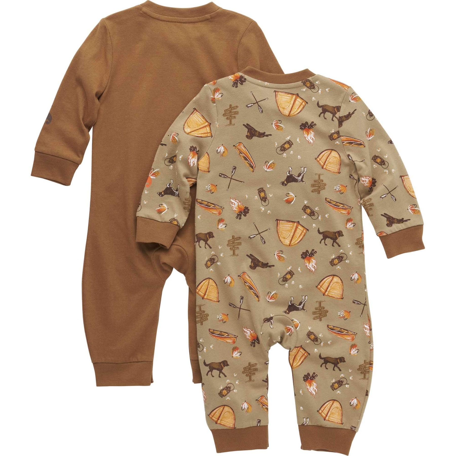 Gear him up for adventure in these baby boys' coveralls. When one gets dirty, you've got a backup set. Both of them have snaps for easy on and off. Both have knee patches, so he can spend hours digging for treasures outside. Both of them have a camp print and a Carhartt logo. Double coverall win.
