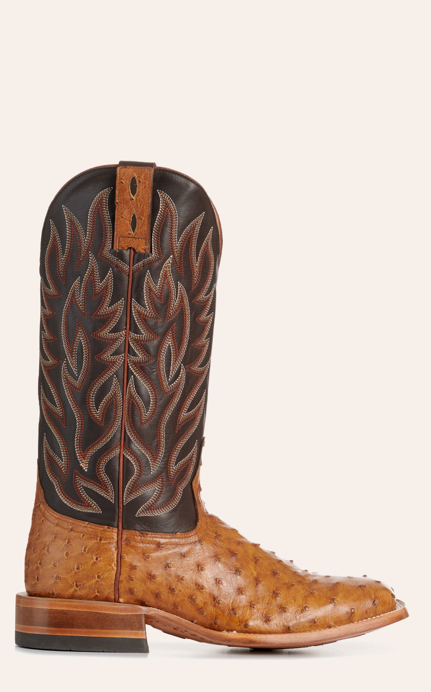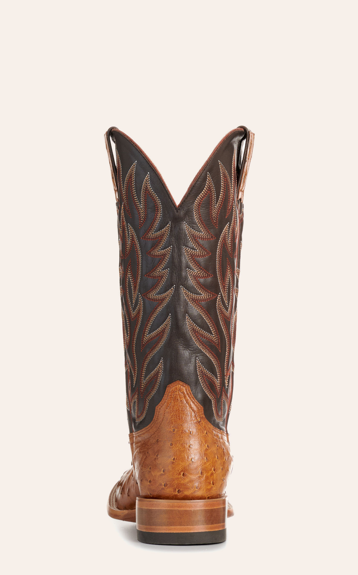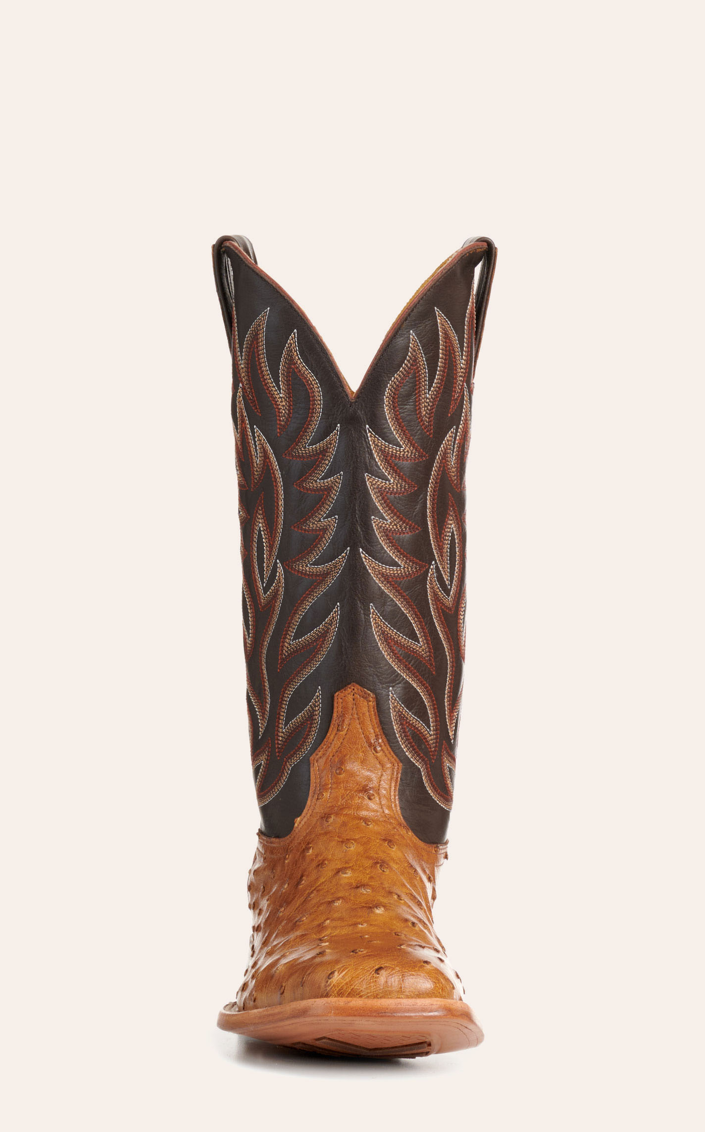 Designed to stand out, this pair of boots features full quill ostrich and a 13-inch chocolate shaft finished in Western stitching. A wide square toe, leather outsole, and block heel give them a confident profile for dinners, gatherings, or nights out. The double-stitched Goodyear welt adds lasting structure, finished with a leather-covered cushioned insole that stays comfortable from the first stop to last call.