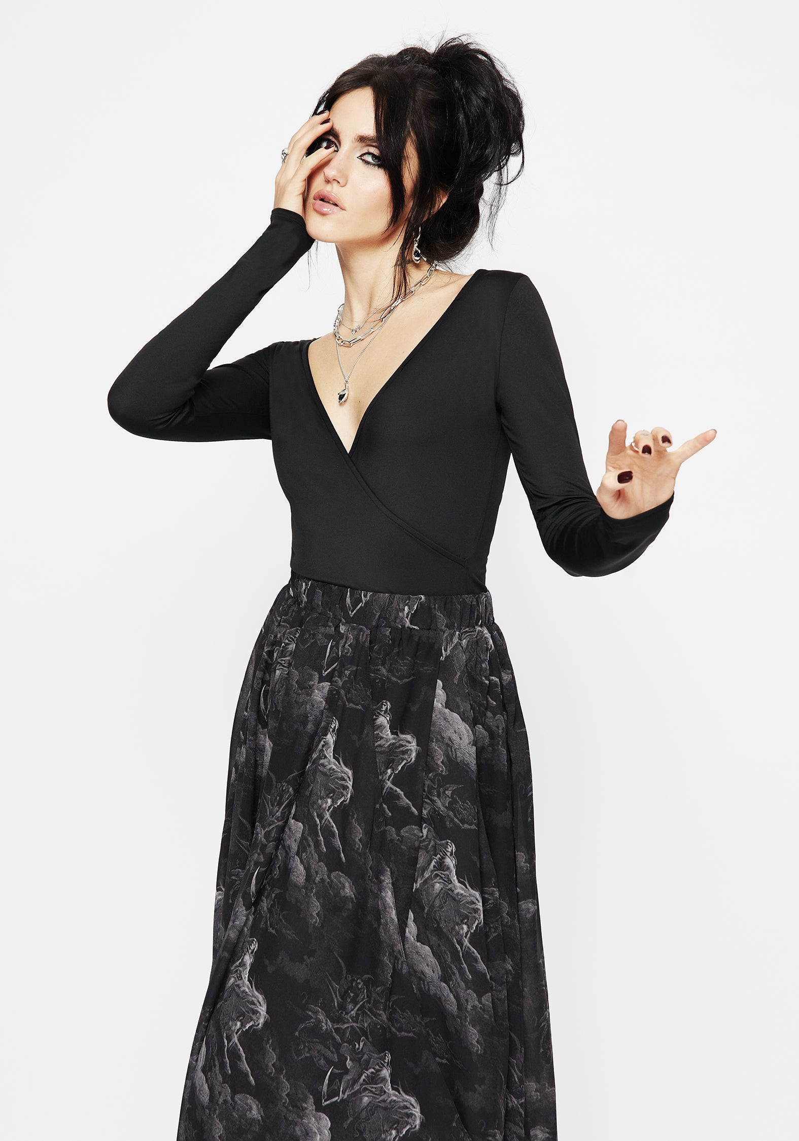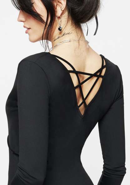 - Black faux wrap bodysuit with strappy back detail - Body-conscious fit in comfortable stretch fabrication - Plunging V-neckline formed by faux-wrap feature - Comfy long sleeves for easy layering - Popper gusset (no need to undress completely just to pee!) - Silky soft stretch fabrication for comfort & mobility - Irregular strappy feature on scoop back - You’re always a winner in a look like this
