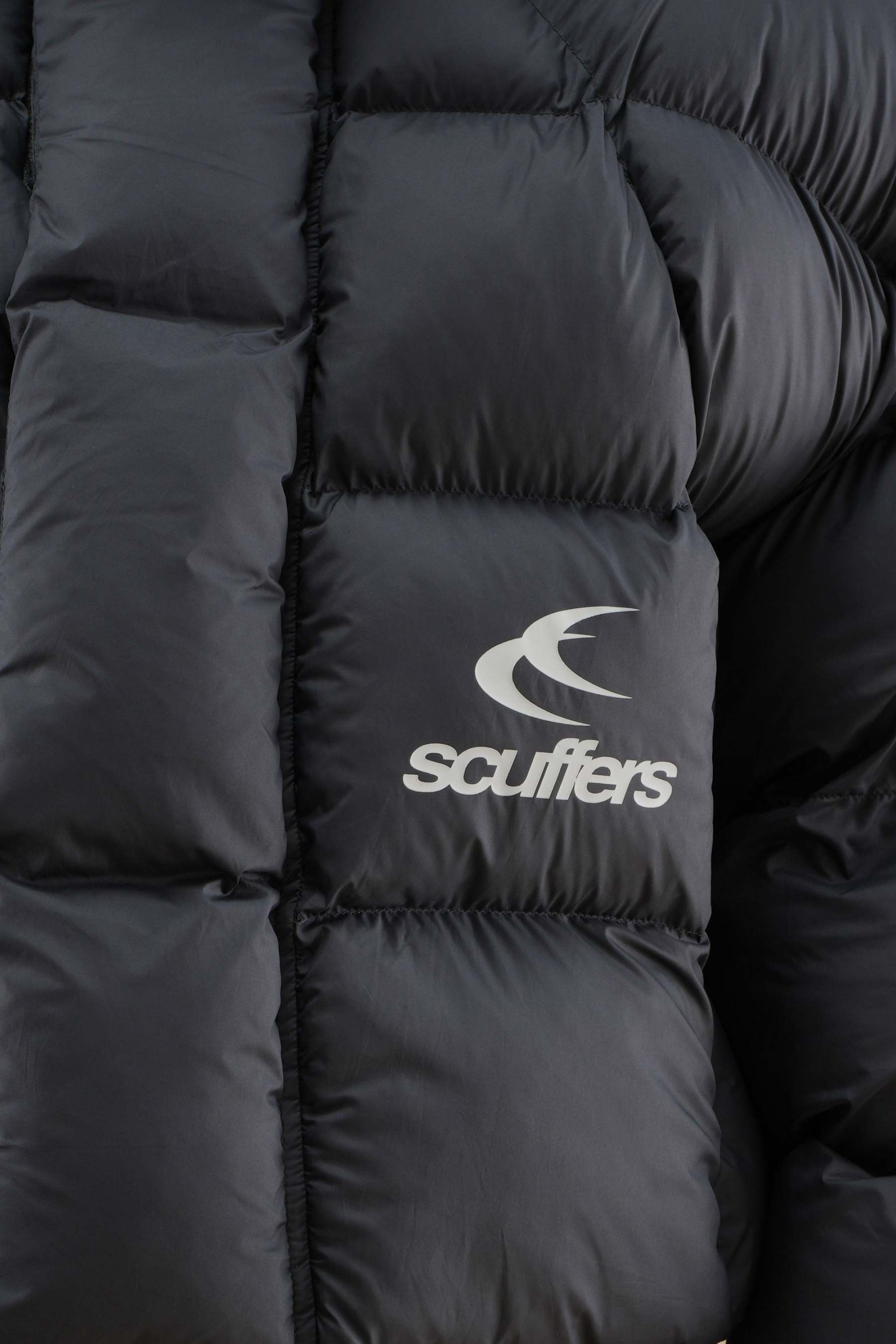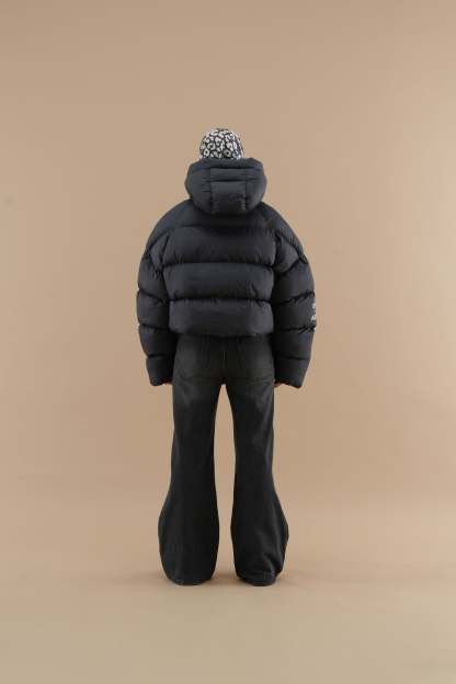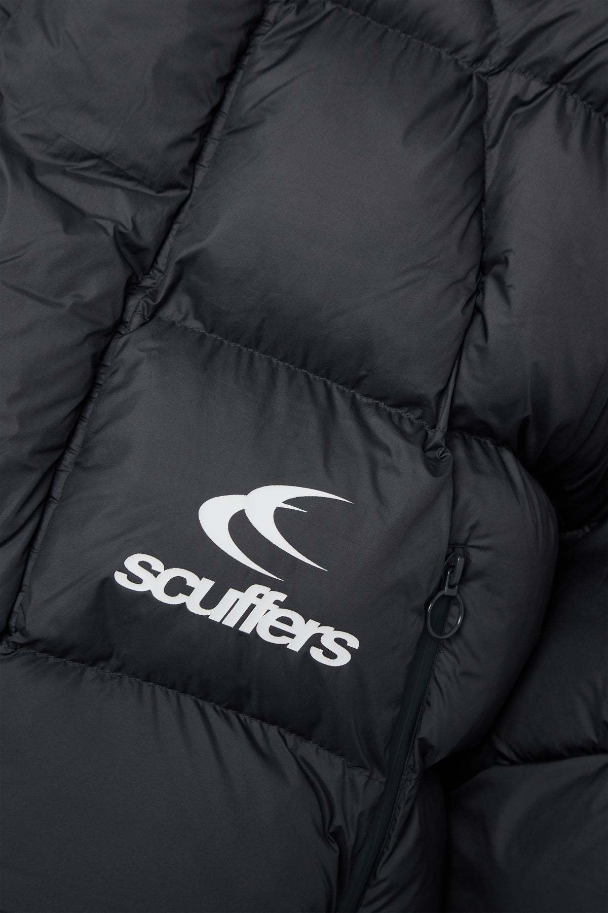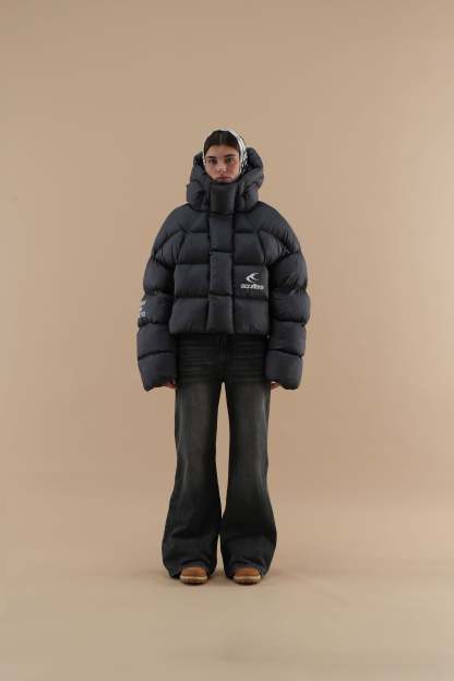 Cropped puffer jacket in black, designed to make a statement while keeping you warm. The jacket features a high-coverage hood for extra insulation and an eye-catching Scuffers logo on the front, along with additional graphic text on the sleeve for a modern touch. Its thick quilted construction provides balanced warmth, while the zippered pockets offer secure storage for small essentials. Ideal for adding a pop of color to cold-weather outfits, this jacket combines functionality with a daring, street-style aesthetic.