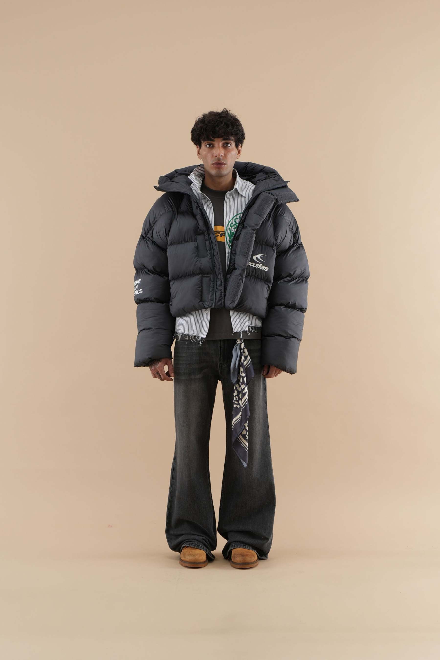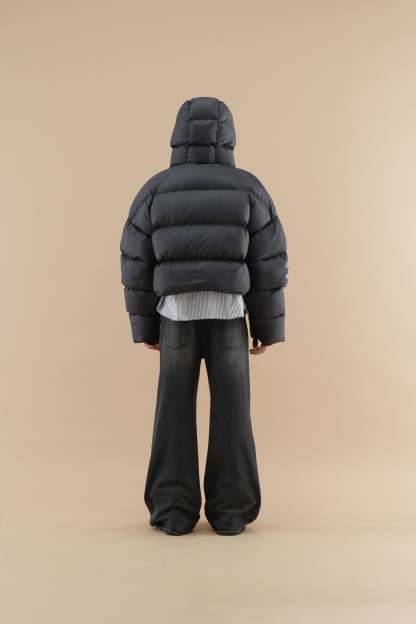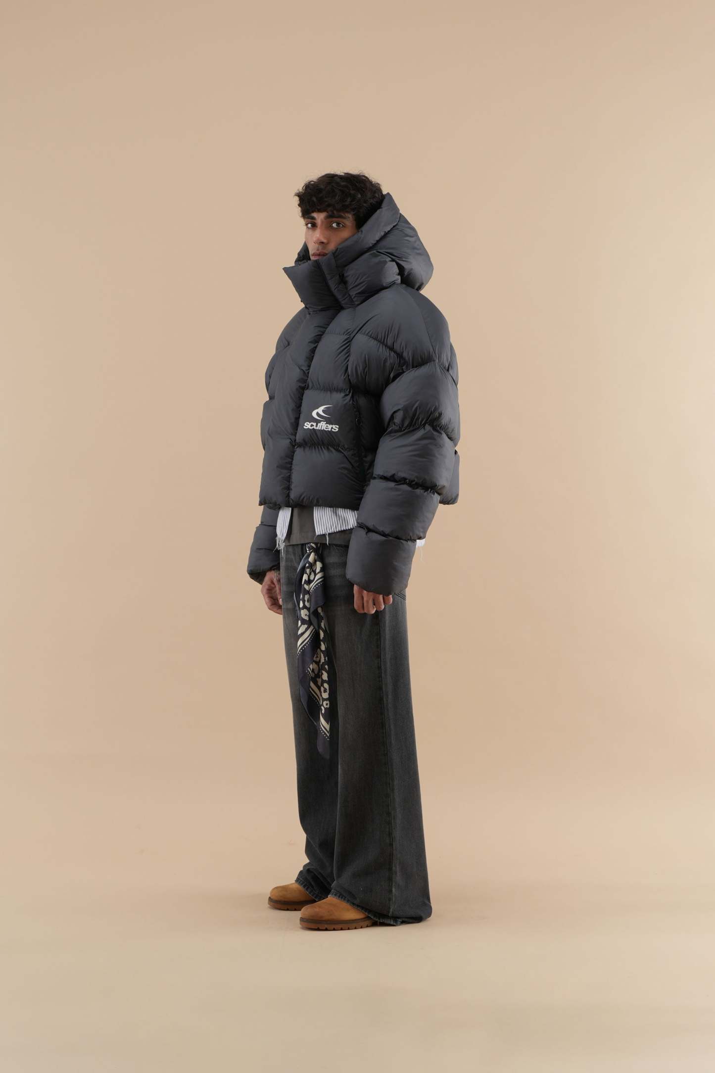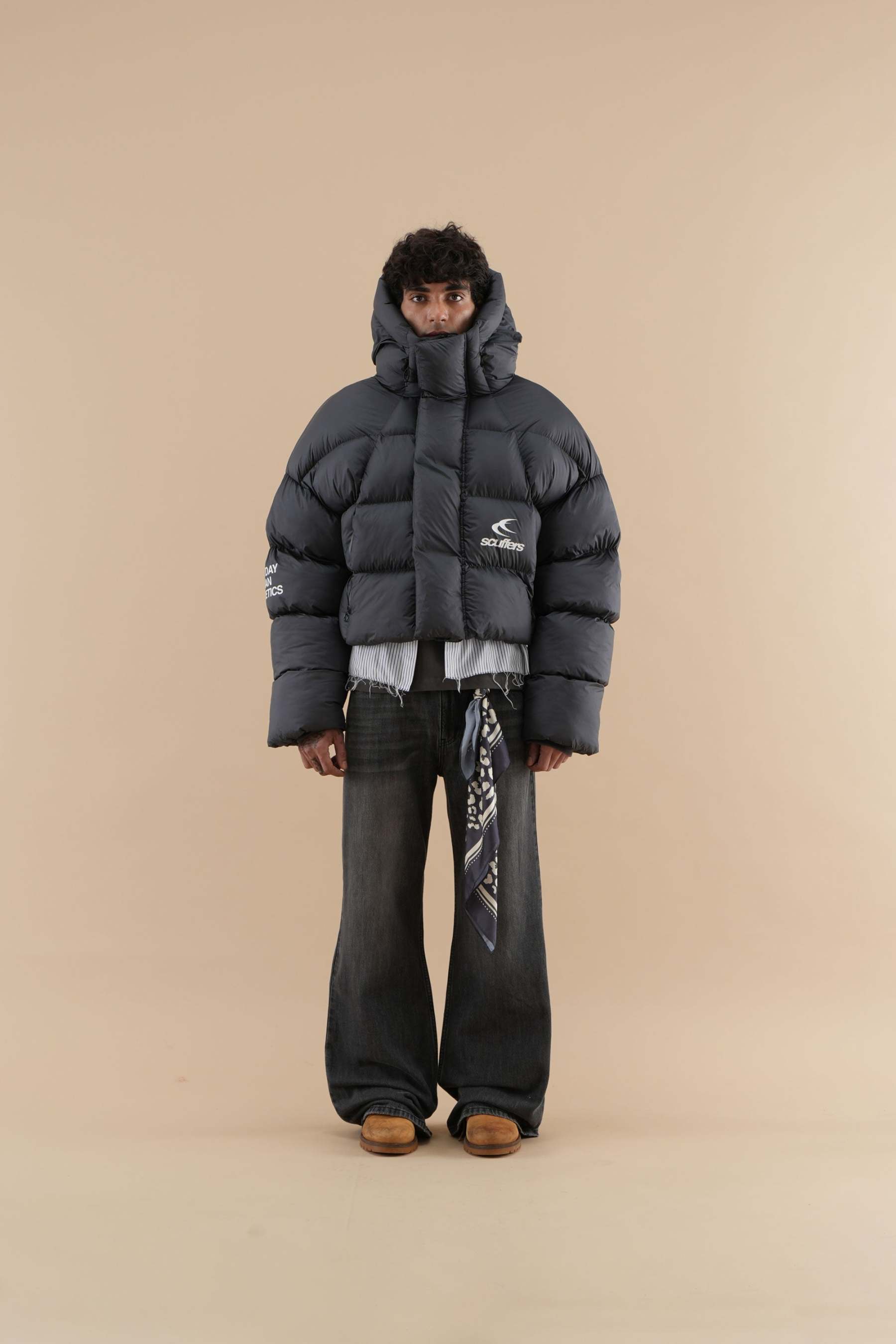 Cropped puffer jacket in black, designed to make a statement while keeping you warm. The jacket features a high-coverage hood for extra insulation and an eye-catching Scuffers logo on the front, along with additional graphic text on the sleeve for a modern touch. Its thick quilted construction provides balanced warmth, while the zippered pockets offer secure storage for small essentials. Ideal for adding a pop of color to cold-weather outfits, this jacket combines functionality with a daring, street-style aesthetic.