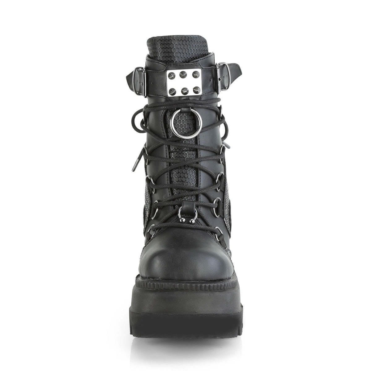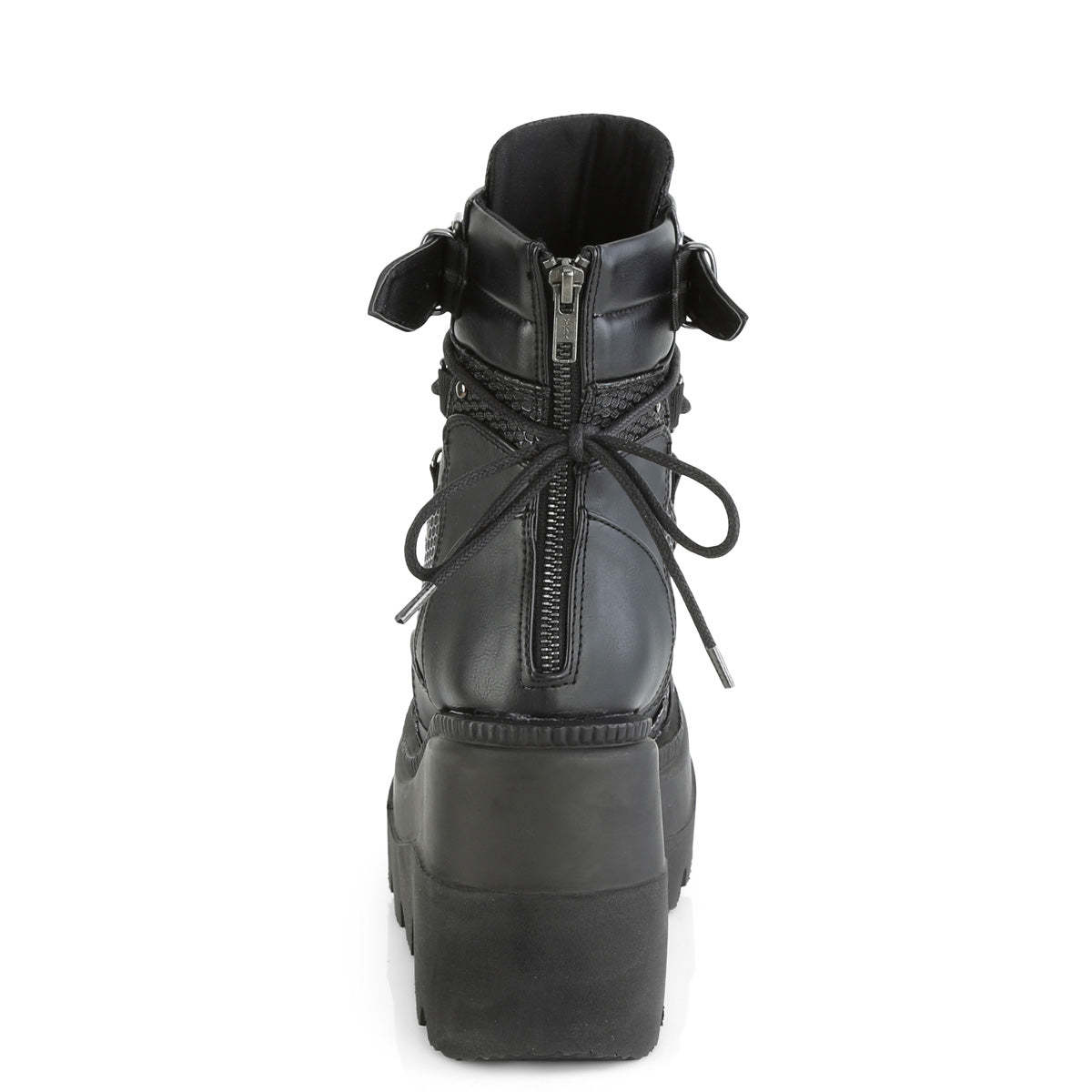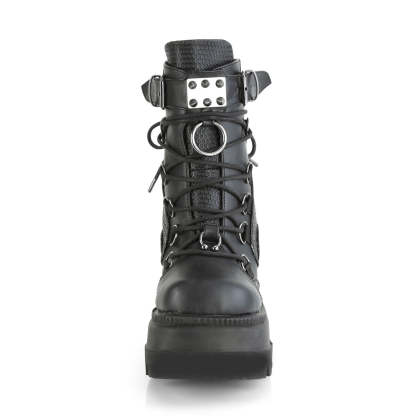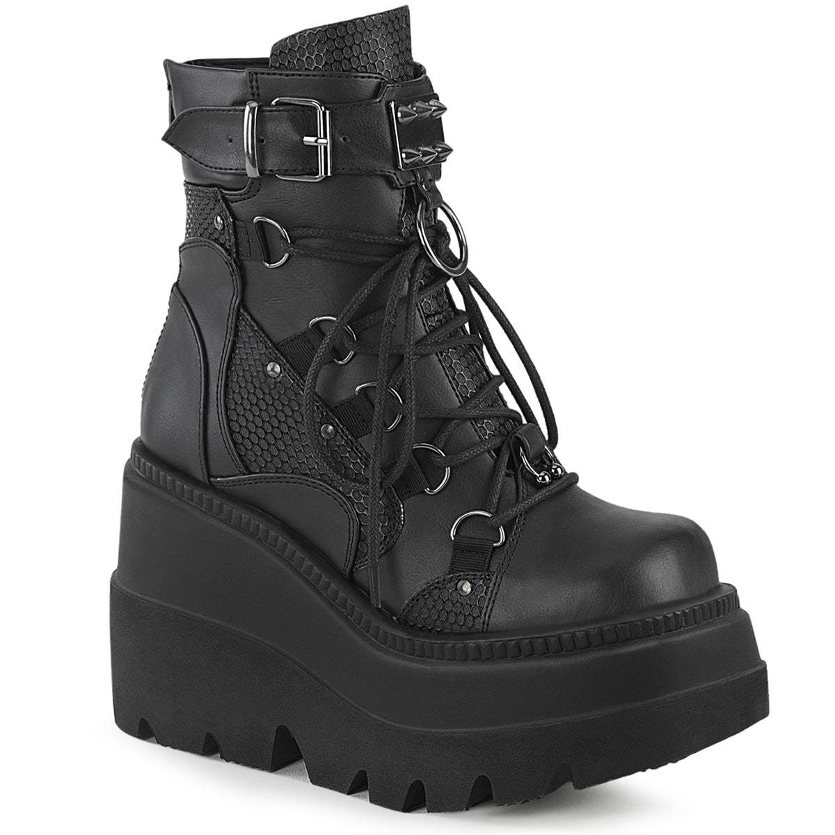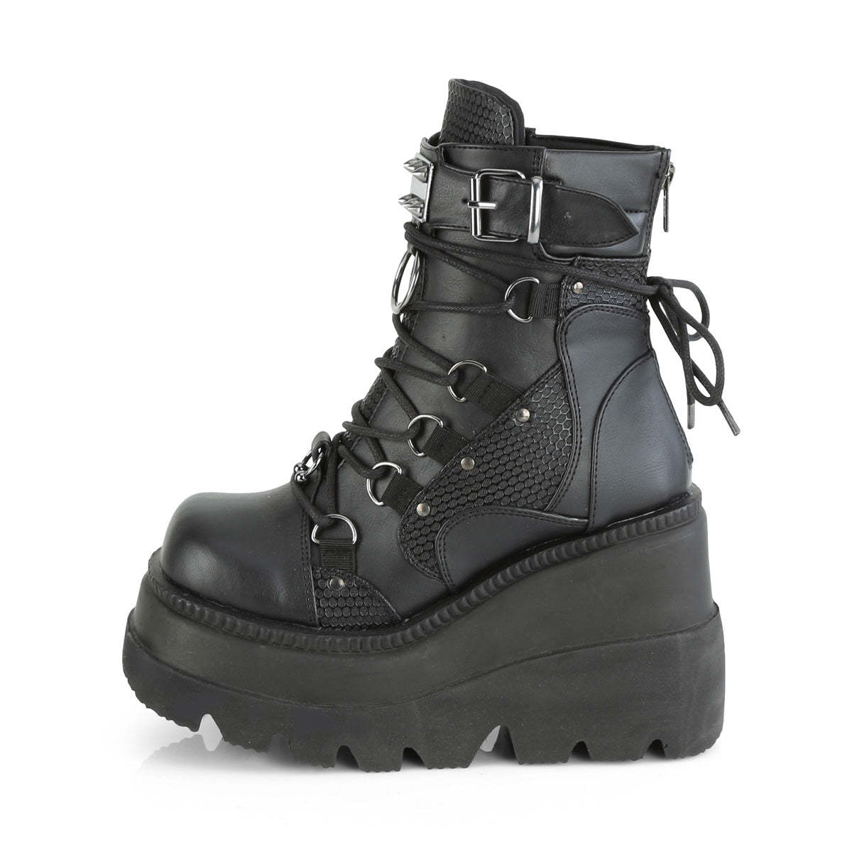 Meet the Shaker-60, a fierce combination of edgy and stylish design. The black vegan leather construction of these boots is adorned with studded contrast panels and pewter tone hardware, providing a head-turning look that's sure to impress. The 4 1/2" wedge platform adds height and comfort, while the dual buckle and lace-up design ensure a secure fit. The Shaker-60 also comes with a spike studded metal plate and large O-ring, adding an extra dose of attitude and style to these already bold boots. The metal back zip closure adds a touch of convenience, while the overall design brings punk rock flair to your look. Whether you're stepping out for a night on the town or just want to add some edgy style to your everyday wardrobe, the Shaker-60 has got you covered. Make a statement and turn heads with these fierce and unforgettable boots.