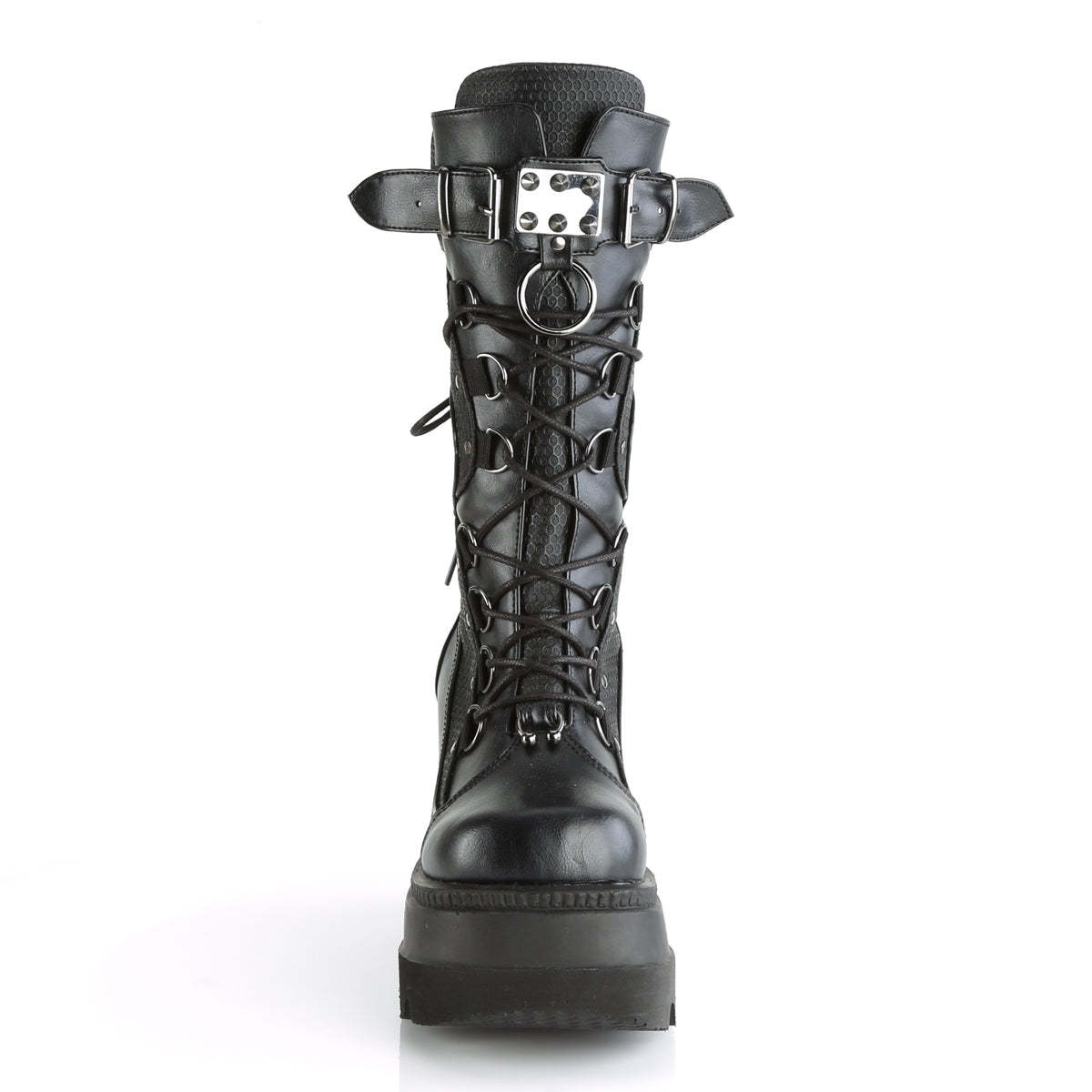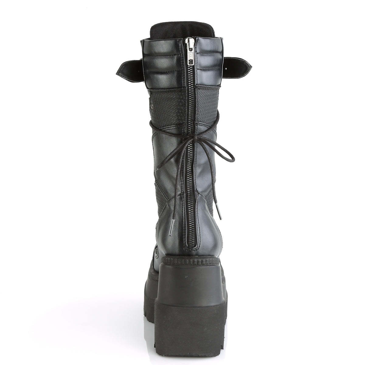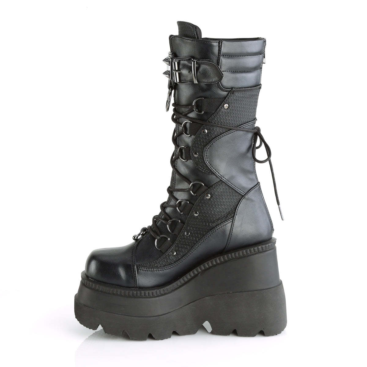 Looking for a boot that combines edgy style with comfort and practicality? Look no further than the Shaker-70 mid-calf boot. Crafted from black vegan leather, these boots are perfect for anyone looking to make a bold fashion statement. The 4.5" wedge platform provides a comfortable and stable base, while the lace-up design offers a customizable fit. The curvy contrast panel designs on the vamp add a touch of unique style, while the spike studded metal plate and large O-ring ornament give these boots an unmistakable punk vibe. The back zip closure ensures easy on and off, making these boots a convenient choice for any wardrobe. Whether you're dressing up for a night out or simply want to add an edgy touch to your everyday look, the Shaker-70 mid-calf boot is the perfect choice for the fashion-forward individual.