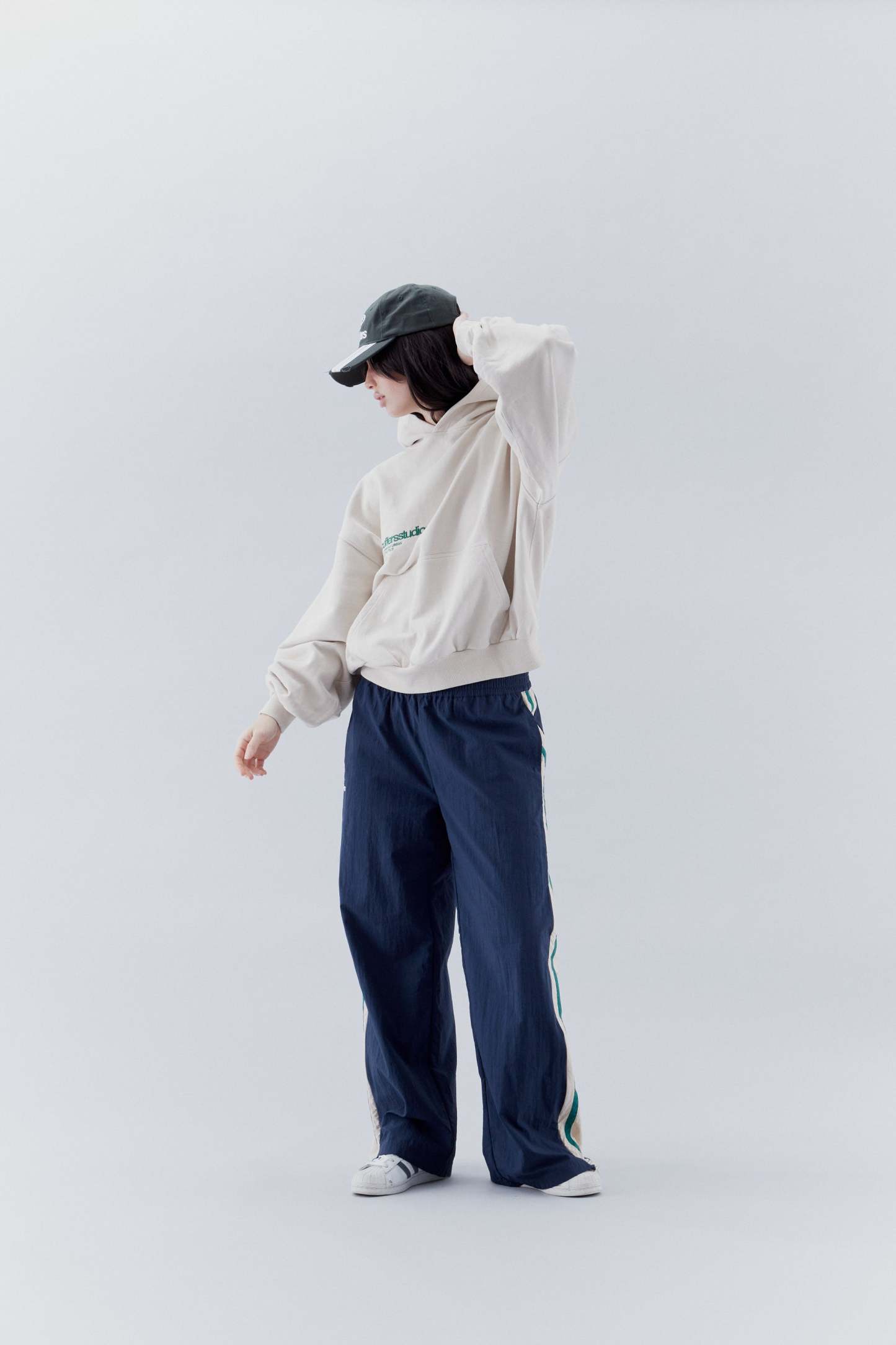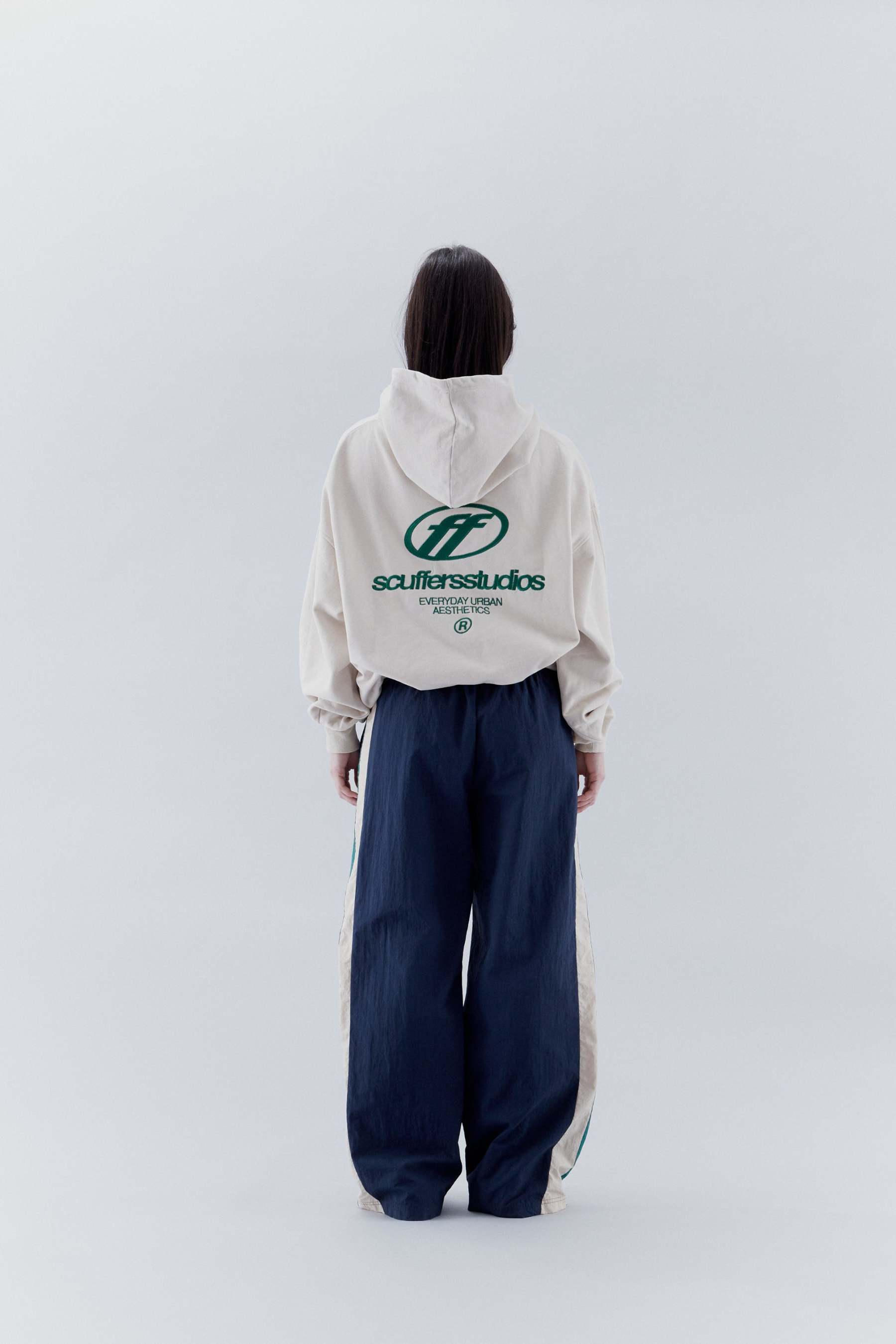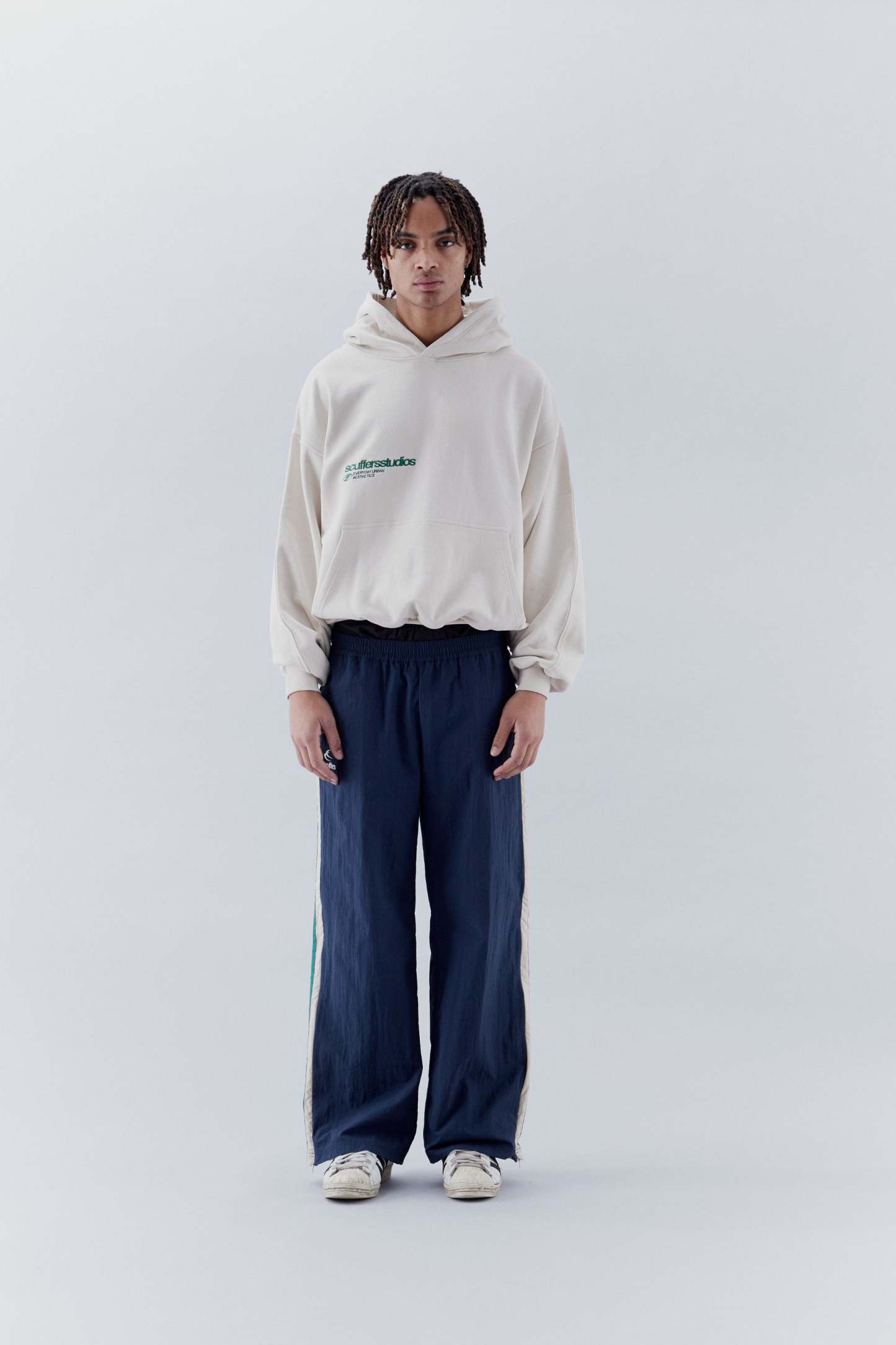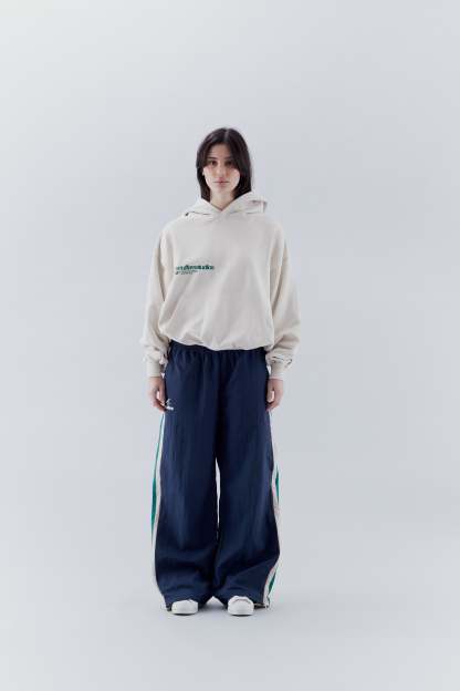 Navy and green nylon long pants. Features two side pockets. Two white lines and a third one in green. One zip on each side at the outside at ankle height to adapt the effect of the end of the trousers. Elasticized waistband. And 'Scuffers' and double logo imprinted on the front bottom left in white.