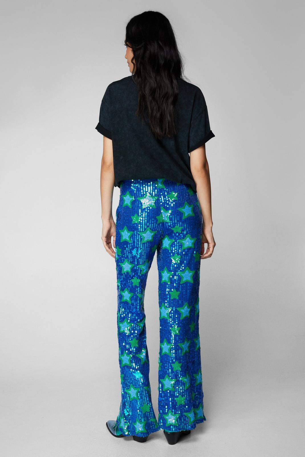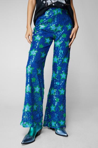 The pants edit. Feel like the centre of attention in our flare pants, made in high quality sequin fabric, with a flattering flared silhouette and a statement star pattern. Style the with a crop top or bralette for a stellar occasion look, perfect for anything from party nights to festival weekends and concerts.