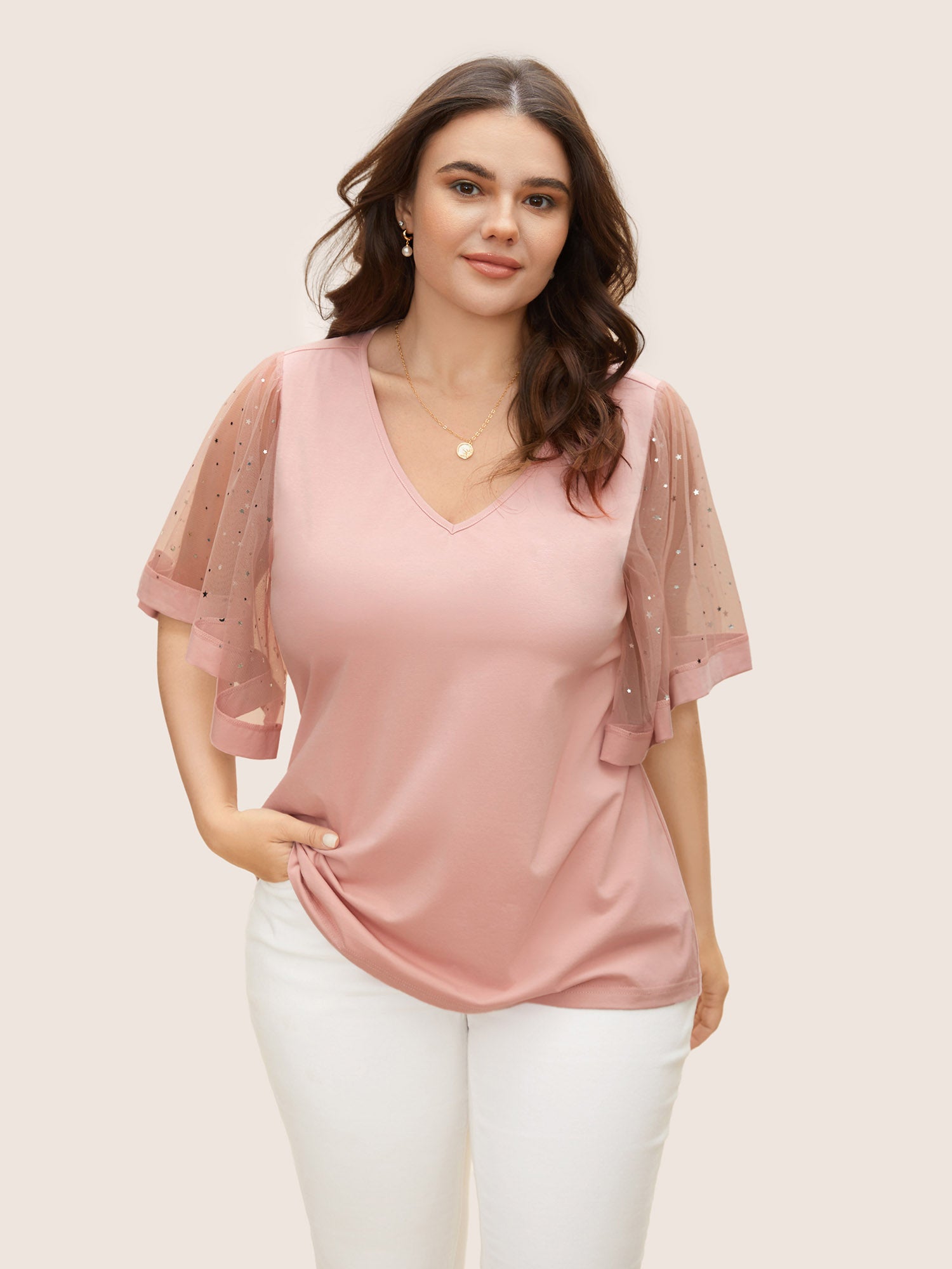 Star Sequin Mesh Patchwork Ruffle Sleeve T-Shirt