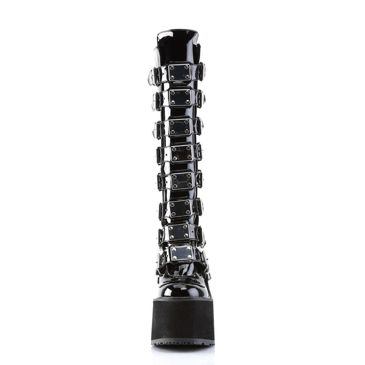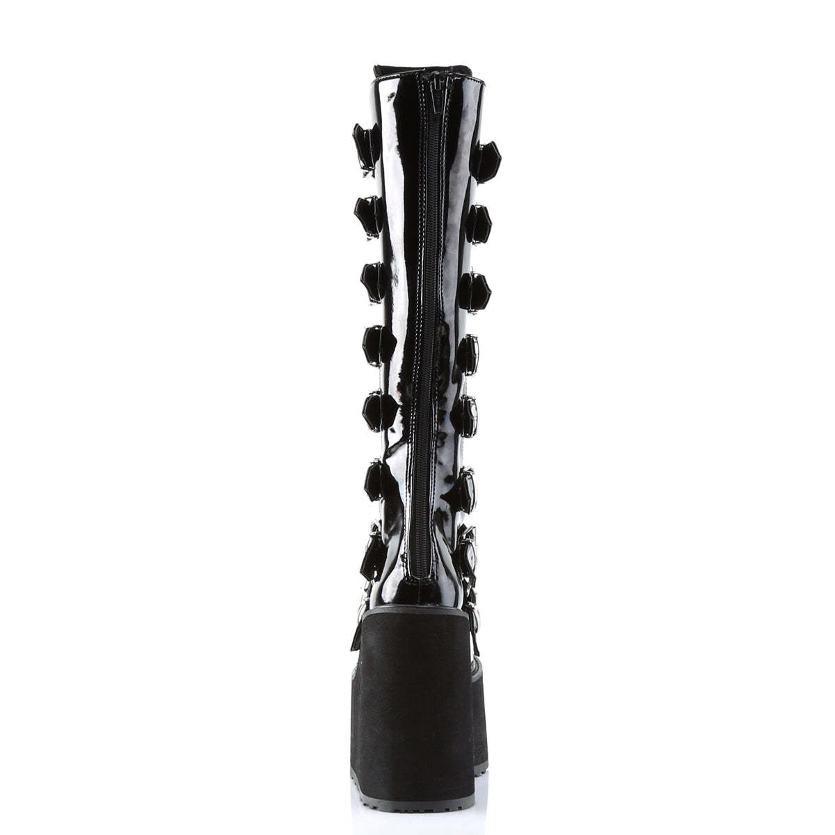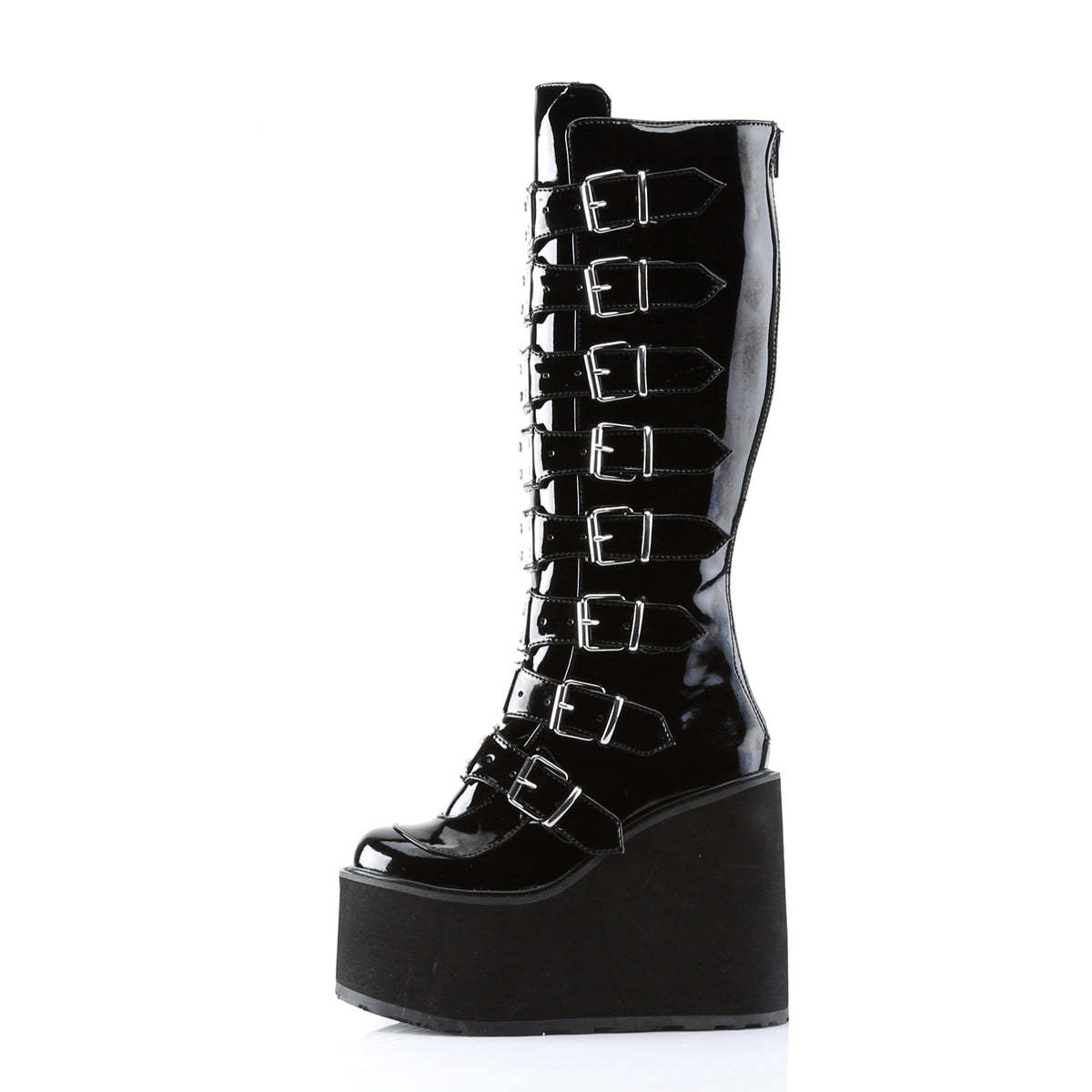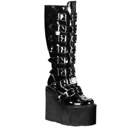 Get ready to unleash your inner goth goddess with the Swing-815 knee boot. With a bold 5 1/2" wedge platform and striking patent leather finish, these boots are the perfect way to elevate any outfit. Featuring eight metal plate buckles that add an edgy touch, these boots are not for the faint of heart. Whether you're hitting the club or just adding some attitude to your everyday style, the Swing-815 is your answer to making a big impression. The full back zip closure makes putting them on or taking them off a breeze. Step out in style and let the world know that you're not to be messed with in these bold and daring boots.