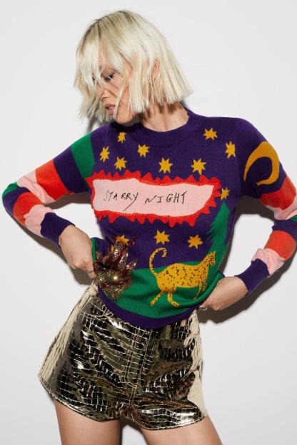 Fancy a tipple? Feel ultra-comfortable in our Christmas sweater, with a starry night inspired design and a cute slogan, as well as a cozy high neckline and a relaxed fit. Style it with jeans or leather pants and boots for a failsafe daytime look, perfect for wearing to upcoming holiday plans.
