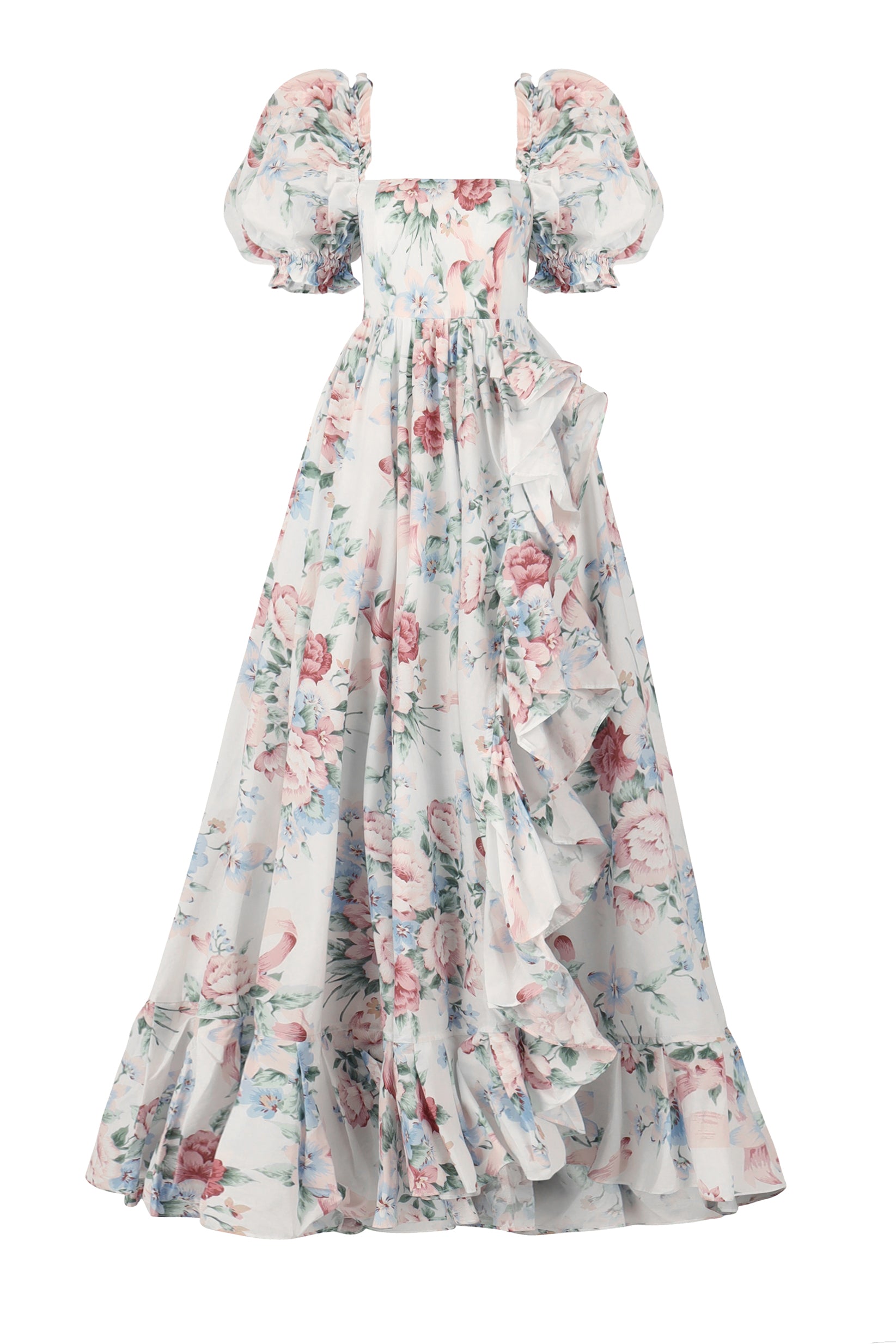 This charming gown features an empire waist and circle cut, ruffle-slit skirt. With a floor-sweeping hem and puff sleeves, this gown stays airy and light thanks to 100% cotton. This print was designed to conjure up the Cotswolds, a region in England that is designated as an Area of Outstanding Natural Beauty (AONB).