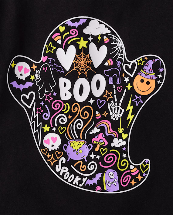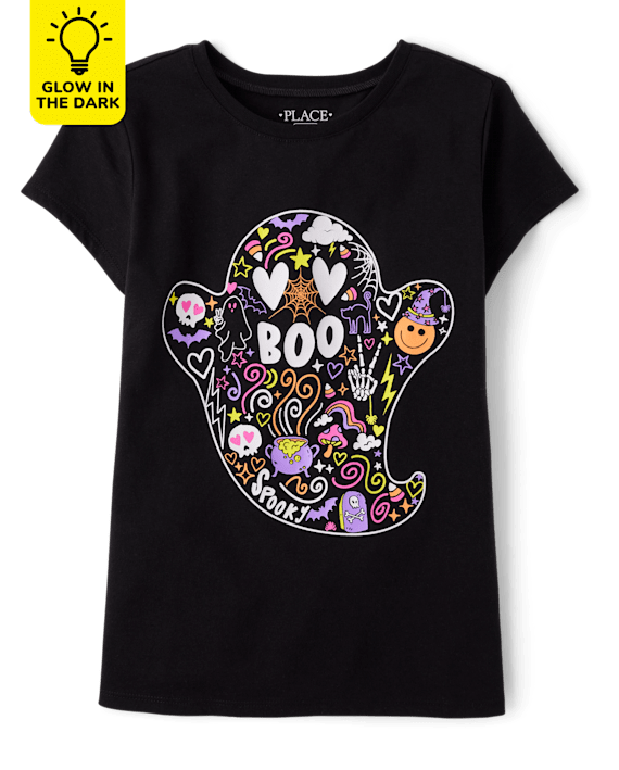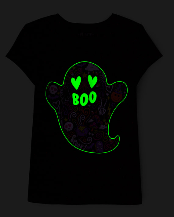 FEATURES: Glow-in-the-dark 'Boo' with icon ghost graphic design, tagless label; for best glow effect, expose to light before wearing