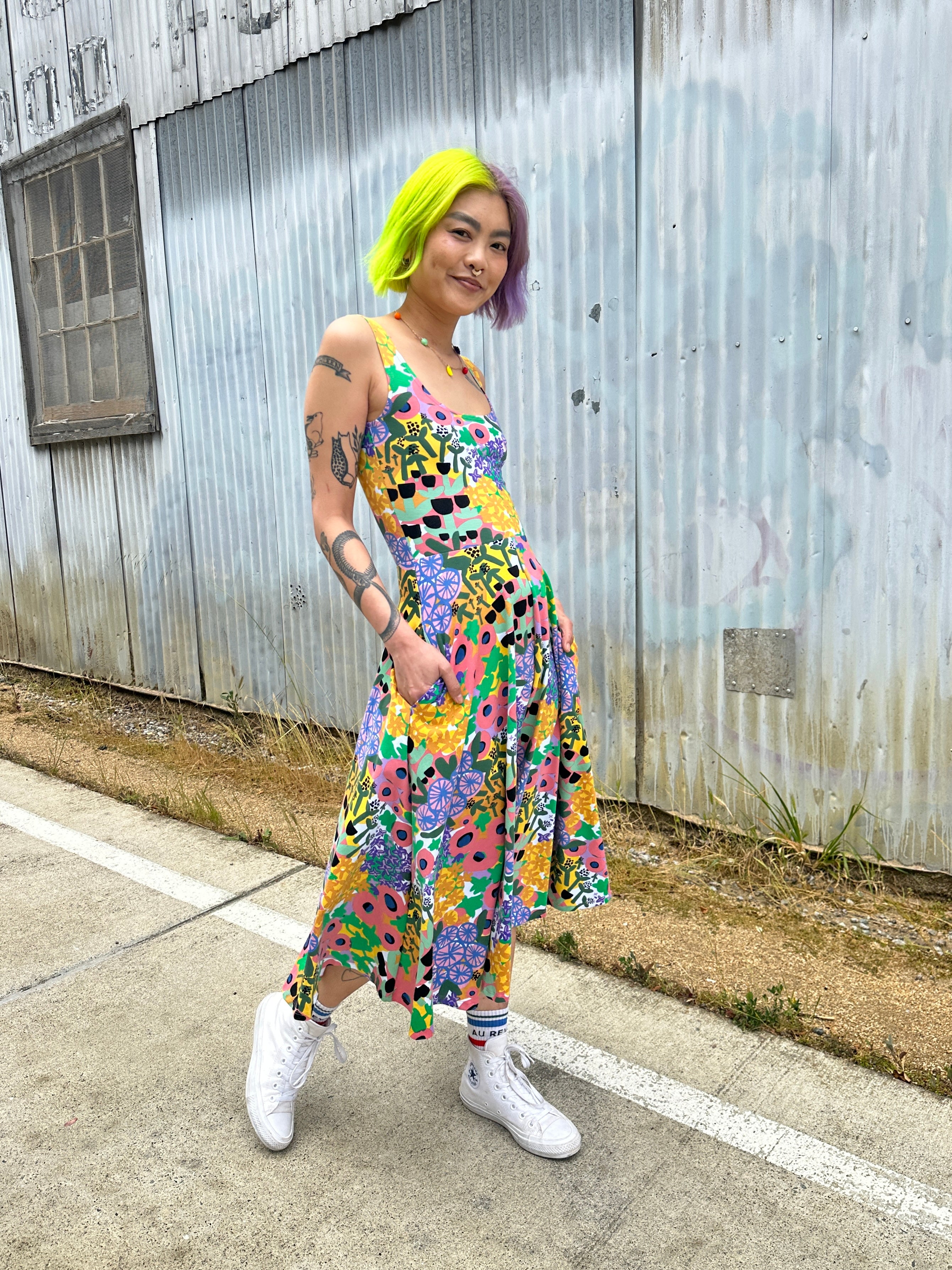 Made in stretch cotton jersey this is the perfect summer fit and flare to wear EVERYWHERE! The fitted tank bodice is extremely flattering and the full skirt is long enough to twirl at any party. And of course, hidden pockets!