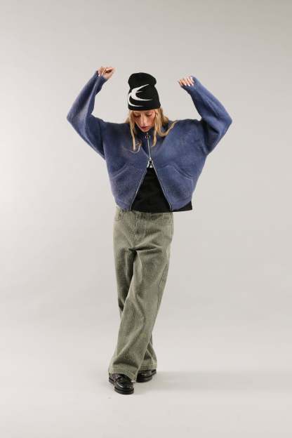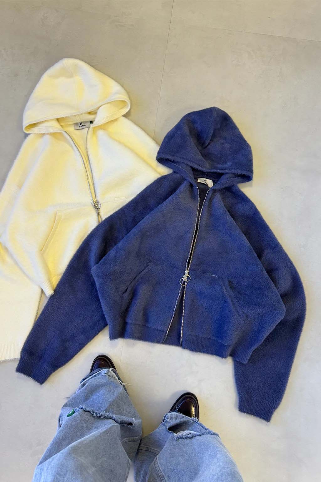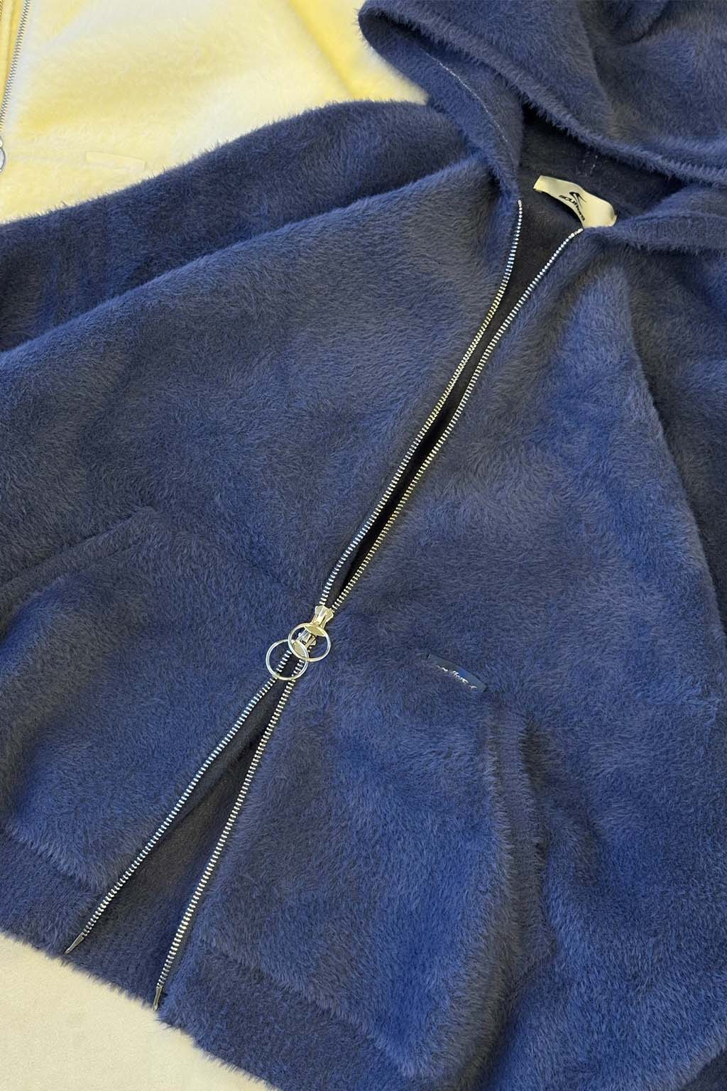 Navy Zip-Up Hoodie crafted from soft, plush fleece fabric for warmth and comfort. Features a full-zip closure with a ring puller, a roomy hood, and kangaroo pockets for added functionality. Ribbed cuffs and hem ensure a secure fit. Relaxed silhouette for versatile layering.