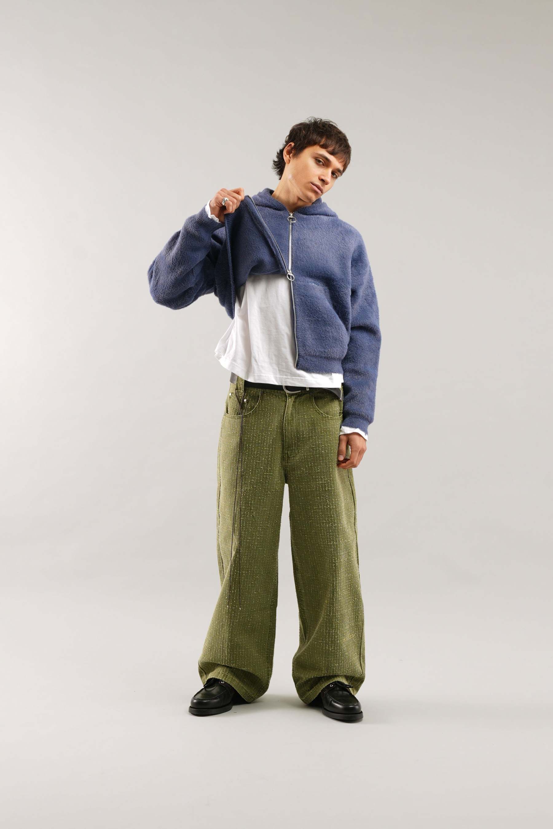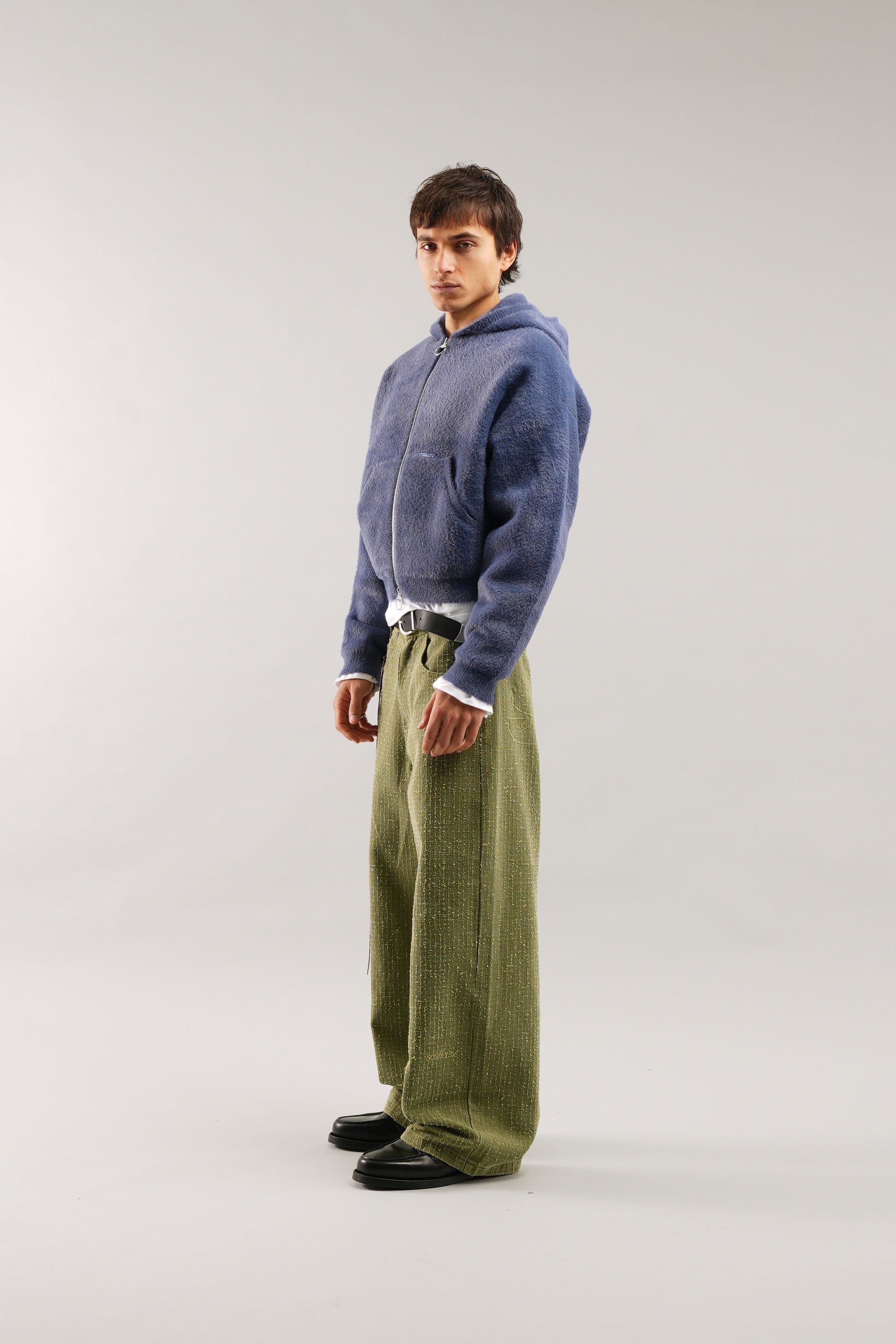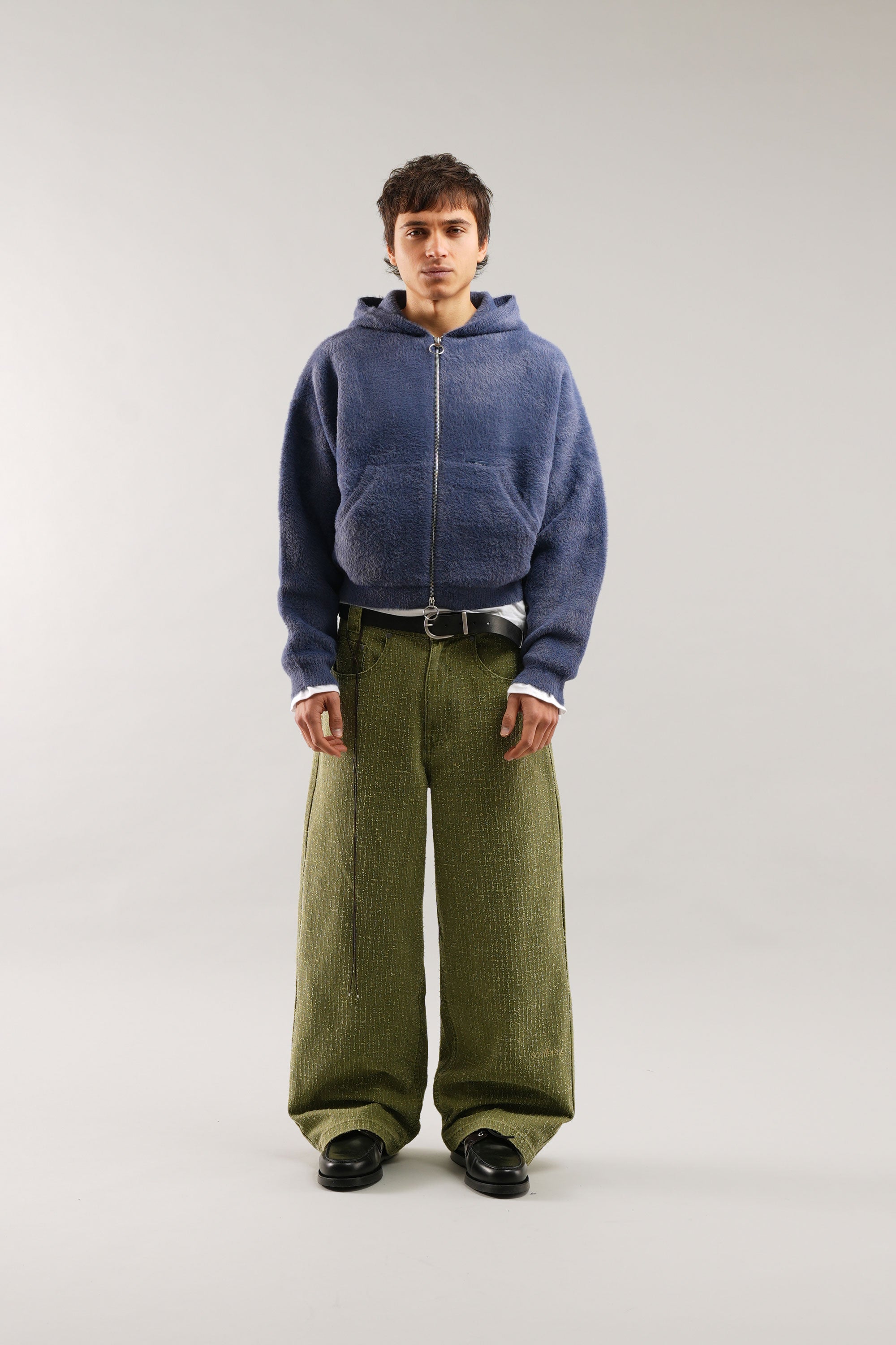 Navy Zip-Up Hoodie crafted from soft, plush fleece fabric for warmth and comfort. Features a full-zip closure with a ring puller, a roomy hood, and kangaroo pockets for added functionality. Ribbed cuffs and hem ensure a secure fit. Relaxed silhouette for versatile layering.