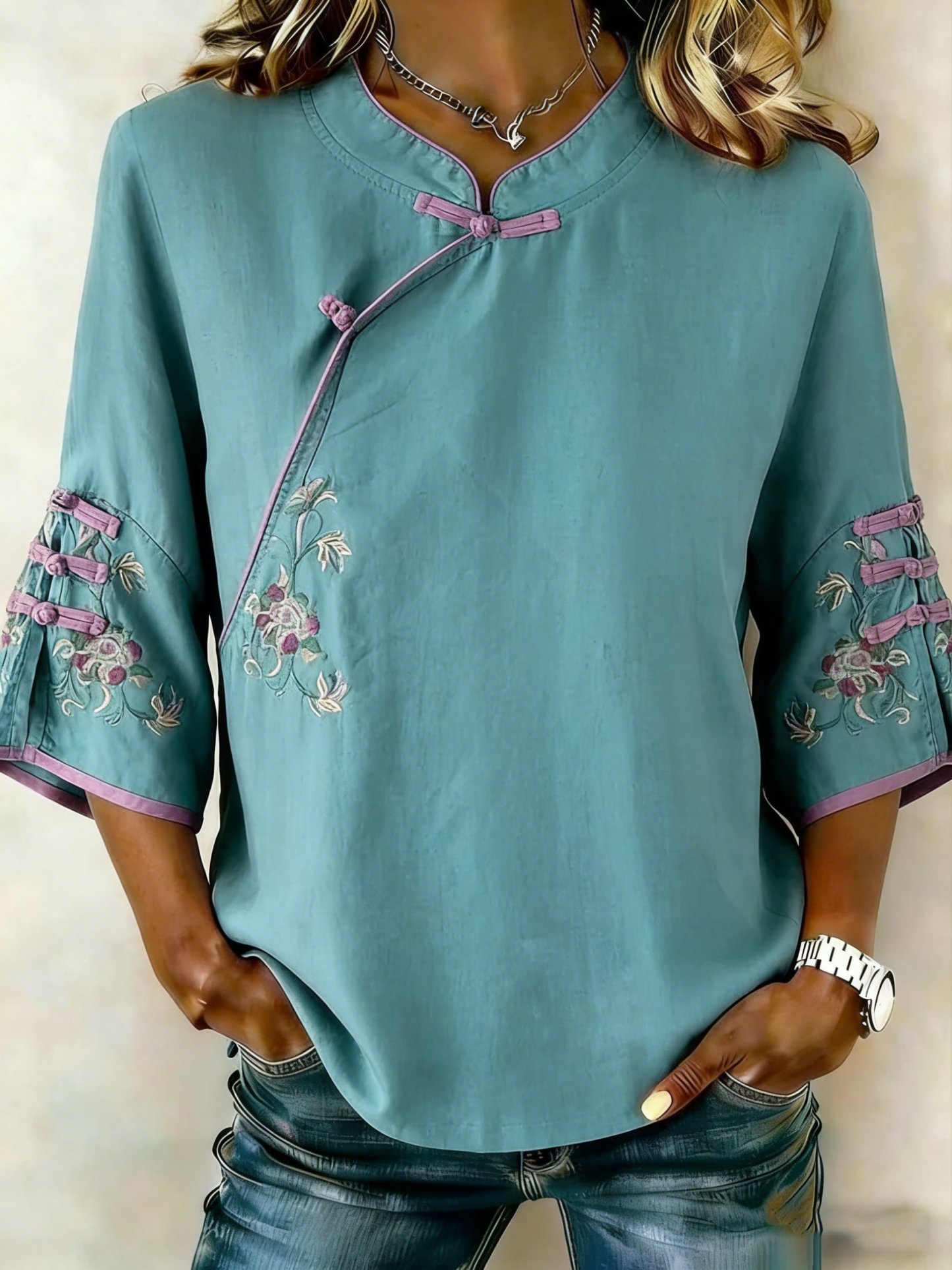Women's Retro Floral Diagonal Placket Button Cotton Linen Three-Quarter Sleeve Shirt